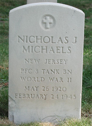 PRIVATE FIRST CLASS NICHOLAS J. MICHAELS lived at 622 North 5th Street in Camden NJ before entering the Army. Inducted early in the war, he was assigned to the 8th Tank battalion, 4th Armored Division. He was killed in action on February 24, 1945 during fighting along the Pruem River near Sinspelt, Germany. His death was reported in the March 29, 1945 edition of the Camden Courier-Post. Nicholas Michaels was brought home after the war. He was buried at Beverly National Cemetery in Beverly NJ on August 14, 1948. |