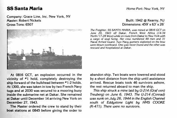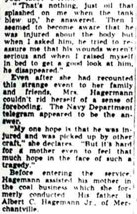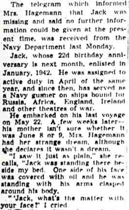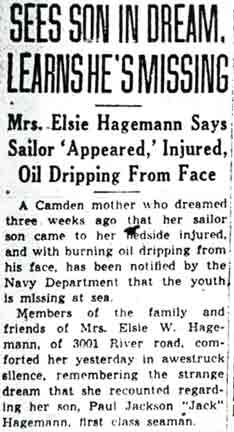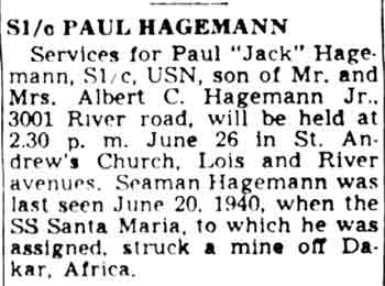 SEAMAN FIRST CLASS PAUL JACKSON HAGEMANN was born in August of 1921 to Albert C. and Elsie Hagemann Jr., of 3015 River Avenue, Camden NJ. His father and his grandfather worked in the wholesale fish and oyster trade. His grandfather, Albert C. Hagemann Sr., had been a principal in an oyster business as far back as 1890 in Philadelphia, before coming to New Jersey to settle in Merchantville. Paul Jackson Hagemann, known to friends and family as Jack, was the third of 6 children, coming after George W. and Albert C. III, and before Elsie A., Ernest C., and Fred W. Hagemann. The Hagemann family had moved to Delaware Township (now Cherry Hill) NJ by 1930. His parents had parted ways prior to World War II, and Elsie Hagemann her son Paul, and the younger children had moved back to 3001 River Avenue, where Elsie Hagemann operated a coal business, with assistance from her sons. After working for the RCA-Victor Corporation in Camden, Paul Jackson Hagemann enlisted in the Navy in January of 1942. He served as a member of the naval Armed Guard that manned the guns on merchant shipping in the North Atlantic. During his time in service, he made trips across the North Atlantic to the British Isles, to North Africa, and the dangerous Murmansk run past Nazi occupied Norway to Murmansk, Russia. Seaman First Class Paul Jackson Hagemann was declared missing in action on June 20, 1943. He was serving aboard the freighter SS Santa Maria. on June 20, 1943. At 0816 GCT on June 20, 1943, while enroute from Dakar in French West Africa with a cargo of sisal hemp, the SS Santa Maria struck a mine. Paul Hagemann was one of two Armed Guards stationed on the bow when the ship hit the mine and both were blown overboard. One was rescued but Seaman First Class Hagemann was lost. He is memorialized on the Tablets of the Missing at North Africa American Cemetery in Carthage, Tunisia. Paul Jackson Hagemann was survived by his father, Albert C. Hagemann Jr., of Merchantville NJ, his mother Elsie Hagemann, of 3001 River Avenue, Camden NJ, and his sister and brothers. |