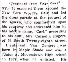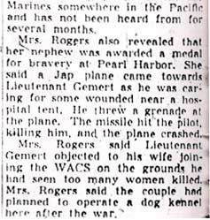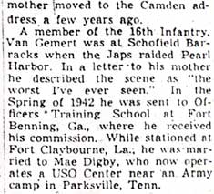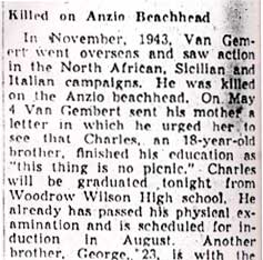 FIRST LIEUTENANT PETER C.J. VAN GEMERT was born in Maple Shade NJ. He was a junior at Moorestown High School in Moorestown NJ when he enlisted in the United States Army in 1937. His mother Evelyn moved to 2924 Federal Street, Camden NJ shortly afterward. In 1939, while an enlisted man, Peter Van Gemert served on the honor Guard for Queen Elizabeth of England during her visit to the New York World's Fair. He was sent to Hawaii in August of 1940, he was serving as a Corporal at Schofield Barracks when the Japanese attacked Pearl Harbor on December 7, 1941. In the Spring of 1942 he was sent to Officers Training School at Fort Benning GA, where he was commissioned as a Second Lieutenant. He was later stationed at Camp Claiborne LA, where he married Mae Digby. Second Lieutenant Van Gemert was killed in Italy in action near the Mussolini Canal - Cisterna River area of the Anzio Beachhead, On May 6, 1944. He was survived by his wife, Mae Digby Van Gemert, mother Evelyn Van Gemert, two brothers, Charles and George, and an aunt, Mrs. Cornelia Rogers, his father, and a half-sister, Elise. |