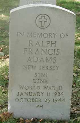 STEWARD'S MATE FIRST CLASS RALPH F. ADAMS was born on January 11, 1926, the fourth of 6 children born to Thomas E. and Emma Adams. In 1930 the Adams family lived at 315 Stevens Street in Camden NJ, where Thomas Adams Sr. worked a laborer in a department store. Two doors down, at 319 Stevens Street, lived the Saporito family, their son Salvatore Saporito would also not come home from the war. The family later moved to 704 Chestnut Street in Camden. Besides Ralph Adams, there were older brothers Logan W., Charles J., older sister, Jeanette R., younger sister Doris E., and younger brothers Thomas E. Adams Jr. and Wilson Adams. Steward's Mate First Class Adams served aboard the USS Tang (SS-306), the most successful of all American submarines. The Navy was still a segregated service during World War II, and Steward's Mate was the only rating open to African-Americans in that service. One of two Steward's Mates aboard Tang, his duties included serving in the officer's mess, aiding in the galley, the officer's wardroom, and the officer's personal quarters. Ralph Adams was listed as missing in action on October 25, 1944 when the Tang was struck by one of her own torpedoes, taking 78 of her 87 man crew to their doom. According to Tang survivor Motor Machinist's Mate Second Class Jesse DaSilva, one of the two Steward's Mates escaped the stricken submarine and reached the surface, only to drown before he could be rescued. It is not known if this individual was Ralph Adams or ST3 H.M. Walker. He was declared dead December 1944. Ralph Adams was survived by his parents, Thomas and Emma Adams, brothers and sisters. A headstone was laid at Beverly National cemetery in Beverly NJ in his memory. The Hudson-Adams-Carpenter Post 473 of the American Legion in Camden NJ is named in part for him, and a distant relative, Jerome L. Carpenter, who died while serving with the United States Army in 1943. |