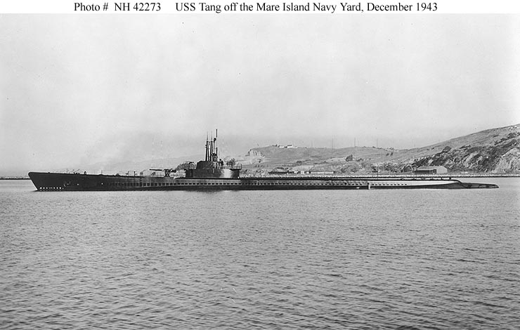 USS TANG (SS-306) completed fitting out at Mare Island and then moved south to San Diego for 18 days of intensive training before sailing for Hawaii. She arrived at Pearl Harbor on 8 January 1944 and conducted two more weeks of exercises in preparation for combat. TANG stood out of Pearl Harbor on 22 January to begin her first war patrol in the Caroline-Mariana Islands area. On the morning of 17 February, she sighted a convoy of two freighters, their escorts, and five smaller ships. The submarine tracked the convoy, plotted its course, and then prepared to attack. An escort suddenly appeared at a range of 7,000 yards and closing. TANG went deep and received five depth charges before the escort departed. Undamaged, she returned to periscope depth and resumed the attack. The range on the nearest freighter closed to 1,500 yards, and TANG fired a spread of four torpedoes. Three of them hit and the freighter sank by the stern. The submarine cleared the area by running deep and then attempted to get ahead of the convoy for a dawn attack, but the remaining freighter passed out of range under air escort. During the night of 22 February, TANG made a surface attack on a convoy of three cargo ships and four escorts. She tracked the Japanese ships for half an hour before attaining a firing position 1,500 yards off the port bow of a freighter. A spread of four torpedoes hit one of the cargomen from bow to stern, and the enemy ship disintegrated. Early the next morning, TANG made another approach on the convoy. The escort of the lead ship moved from its covering position on the port bow, and the submarine slipped into it and fired four torpedoes. The first hit the stern of the cargoman, the second struck just aft of the stack; and the third burst just forward of the bridge and produced a terrific secondary explosion. The ship was twisted, lifted from the water, and began belching flames as she slid beneath the waves. On the morning of the 24th, TANG sighted a tanker, a freighter, and a destroyer. Rain squalls hampered her as she attempted to attain a good firing position, so she tracked the ships until night and then made a surface attack. She fired four torpedoes and scored three hits which sank the freighter. The two remaining ships commenced firing in all directions, and TANG submerged to begin evasive action. She shadowed the enemy until morning and then closed the tanker for a submerged attack. Additional lookouts had been posted on the target's deck and, when the spread of torpedoes from TANG struck her, they were hurled into the air with other debris from the ship. The tanker sank in four minutes as TANG went deep and rigged for the depth charge attack that followed. The next day, the submarine sank a 1,794-ton cargo ship. TANG contacted a convoy consisting of a freighter, transport, and four escorts on the evening of the 26th. She maneuvered into position to attack the wildly zigzagging transport and fired her last four torpedoes. All passed astern as the transport speeded up. Having expended all of her torpedoes and scored 16 hits out of 24 attempts, the submarine put into Midway Island for refit. TANG 's second patrol began on 16 March and took her to waters around the Palaus, to Davao Gulf, and to the approaches to Truk. She made only five surface contacts and had no opportunity to launch an attack before she was assigned to lifeguard duty near Truk. TANG rescued 22 downed airmen and transported them to Hawaii at the conclusion of the patrol. Her third war patrol was one of the most devastating carried out against Japanese shipping during the war. TANG got underway from Pearl Harbor on 8 June and hunted enemy shipping in the East China Sea and Yellow Sea areas. On the 24th, southwest of Kagoshima, the submarine contacted a convoy of six large ships guarded by 16 escorts. TANG closed for a surface attack and fired a spread of three torpedoes at one of the ships and quickly launched a similar spread at a second target. Explosions followed, and TANG reported two ships sunk. However, postwar examination of Japanese records revealed by the Japanese government show that two passenger-cargo ships and two freighters were sunk. The ships must have overlapped, and the torpedo spread must have hit and sunk two victims in addition to their intended targets. Those sunk added up to 16,292 tons of enemy shipping. On 30 June, while she patrolled the lane from Kyushu to Dairen, TANG sighted another cargo ship steaming without an escort. After making an end around run on the surface which produced two torpedo misses, TANG went deep to avoid depth charges, then surfaced and chased the hapless ship until she closed the range to 750 yards. A single torpedo blew it in half, and the merchantman sank. The next morning, TANG sighted a tanker and a freighter. While she sank the freighter, the tanker fled. The submarine trailed until dark, then fired two torpedoes which sent the latter down. TANG celebrated the Fourth of July at dawn by an end-around, submerged attack on an enemy freighter which was near shore. However, with rapidly shoaling water and her keel about to touch bottom, TANG backed off; fired a spread of three with two hits and then surfaced as survivors of the 6,886-ton cargo ship were being rescued by fishing boats. That afternoon, TANG sighted another cargo ship of approximately the same size, and sank her with two torpedoes. The submarine surfaced and, with the aid of grapnel hooks and Thompson submachine guns, rescued a survivor who had been clinging to an overturned lifeboat. While prowling the waters off Dairen late the next night, the submarine sighted a cargo ship and, during a submerged attack with her last two torpedoes, sank it. The box score for her third patrol was 10 enemy merchant ships sunk that totaled 39,160 tons. Her fourth war patrol was conducted from 31 July to 3 September in Japanese home waters off the coast of Honshu. On 10 August, she fired a spread of three torpedoes at a tank