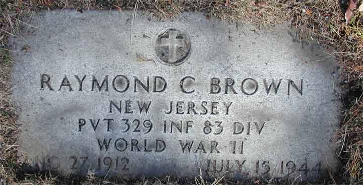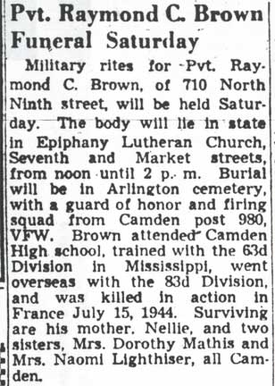 PRIVATE RAYMOND CHARLES BROWN was born August 27, 1912 to William H. and Nellie May Brown. Raised in Camden NJ, he had attended Sewell, Camden Junior High School #1, and Camden High School. After leaving school, he worked with his father at a yarn mill, he also worked for the J.S. Reid Company in Camden. He had grown up at 710 North 9th Street in Camden NJ prior to entering the United States Army on August 26, 1943, a home his parents had owned since at least 1920. The oldest of three children, he had two sisters, Dorothy May and Naomi. Private Brown trained at Camp Van Dorn LA and Camp Breckenridge KY before he was sent overseas. He was killed in action in France on July 15, 1944. 31 years old at the time of his death, he was survived by his mother, Nellie Brown, of the 9th Street address, and two sisters, Mrs. Dorothy Mathis and Mrs. Naomi Lighthiser, both of Camden. His death was reported in the September 19, 1944 edition of the Camden Courier-Post. Raymond Charles Brown was brought home to New Jersey after the war ended. He was buried at Arlington Cemetery in Pennsauken NJ on April 17, 1948. |