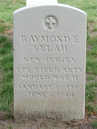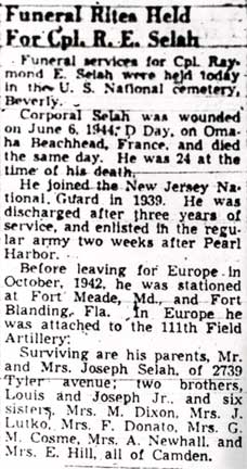 CORPORAL RAYMOND E. SELAH was born in New Jersey on January 26, 1920 to Joseph L. and Helen M. Selah. Joseph Selah worked as a caulker in one of the many shipyards in Camden NJ, more than likely the Noecker, Rickenbach, and Ake Shipyard, which specialized in the construction and repair of wooden ships and boats, and which was short walk from the family home of 1201 North 28th Street, in Camden's Cramer Hill section. By 1930 Oldest son Joseph L. Jr. was working alongside his father at the shipyard. Besides Joseph L. Jr. and Raymond, the other children in the family as of 1930 were Ella, Catherine, Margaret, Eleanor, Helen, Esther, and Louis C. Selah. Oldest sister Ella was married to William Dixon, a power house operator, and the couple lived with the Selah family. Raymond E. Selah had been a member of the New Jersey National Guard. Assigned to the 111th Field Artillery Battalion, 29th Infantry Division, he went overseas in the fall of 1943. The 29th Infantry Division was based at Tidworth Barracks in southern England, and trained there and in Devon and Cornwall in preparation for D-Day. The 111th Field Artillery landed on Omaha Beach in Normandy on D-Day, June 6, 1944. From the outset, things went very badly for this unit. Of the twelve 105 mm howitzers of the battalion, four were lost when a DUKW landing craft hit a mine, and seven of the eight remaining artillery pieces failed to come ashore as their DUKW amphibious trucks swamped in the water approaching the beach. All of the thirteen DUKWs assigned to the 11th took hits. The dazed survivors struggled ashore near Les Moulins at 8:30 AM and were told by commanding officer Lt. Col. Thornton Mullins "To Hell with our artillery mission, we're infantrymen now". A sniper soon killed the colonel, but his troops were active in the drive inland. Private Raymond E. Selah was severely wounded during the landing, and died of the wounds he suffered later that day, on June 6, 1944. His body was returned home after the war, and he was interred at Beverly National Cemetery in Beverly NJ on December 8, 1947. |