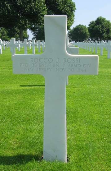 PRIVATE ROCCO J. ROSSI was the son of Nicholas and Mary Rossi, of 347 Liberty Street in Camden NJ. He was born in New Jersey in 1924. Rocco Rossi entered the work force after two years of high school. He was inducted into the United States Army on May 5, 1943 at Camden NJ, and received three moths of training at the Armored Force Replacement Center at Fort Knox KY. In September of 1943, it was reported that he had completed that training, and had been selected to train as a radio electrician at the Fort Knox Armored School. While serving with the 7th Armored Division, he was killed in action on November 30, 1944 near Gereonsweiler, Germany. The 33rd Armored Engineer Battalion After Action Report for November 1944 reads as follows: Near the close of the period the 40th Tank Battalion was attached to a regimental combat team of the 84th Infantry Division for an operation against Linnich and Beeck, Germany from the vicinity of Gereonsweiler. Company "C" was included in the task force to provide engineer assistance in crossing a known anti-tank ditch and for any other engineer work needed. The operation was conducted on 30 November. Tanks passed through the obstacle successfully after gaps were located and swept for mines. It is likely that Private Rossi was killed either in the bridging of the ditch or during the mine-sweeping operations. Three other members of Company C were wounded that day. Private Rossi was posthumously awarded the Silver Star medal and the Purple Heart. He was survived by his parents, of the Liberty Street address. |