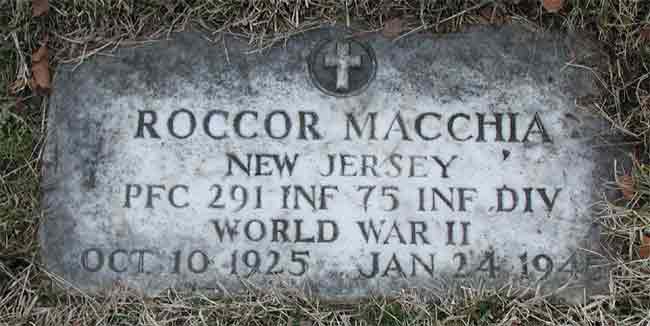 him. Rocco Macchia was killed in action in January of 1945 in Belgium, while serving with the 291st Infantry Regiment, 75th Infantry Division in fighting in the Salm River valley, during the Battle of the Bulge. He was survived by his parents of 241 Chestnut Street, Camden NJ. Rocco Macchia was brought home aboard the USAT Joseph V. Connolly , arriving October 27, 1947. He was buried at Calvary Cemetery in what was them Delaware Township (present day Cherry Hill) NJ, where he rests next to his parents and his maternal grandfather. |