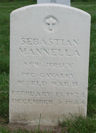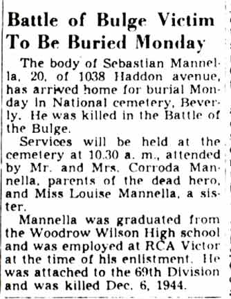 PRIVATE SEBASTIAN MANNELLA lived at 1038 Haddon Avenue, Camden NJ. Born Sebastian Mannello to Corrado and Alfia Mannello, when inducted into the Army he went by the name of Sebastian Mannella. Sebastian Mannella attended Woodrow Wilson High School in Camden NJ, and had worked as a machinist at the RCA plant there before answering the call to arms, in May of 1942. Private Sebastian Mannella was killed in action on December 5, 1944 in Luxembourg. He was was brought home aboard the USAT Joseph V. Connolly , arriving October 27, 1947. , Sebastian Manella was buried at Beverly National Cemetery in Beverly NJ. He is also memorialized at the family plot at New St. Mary's Cemetery in Bellmawr NJ. |