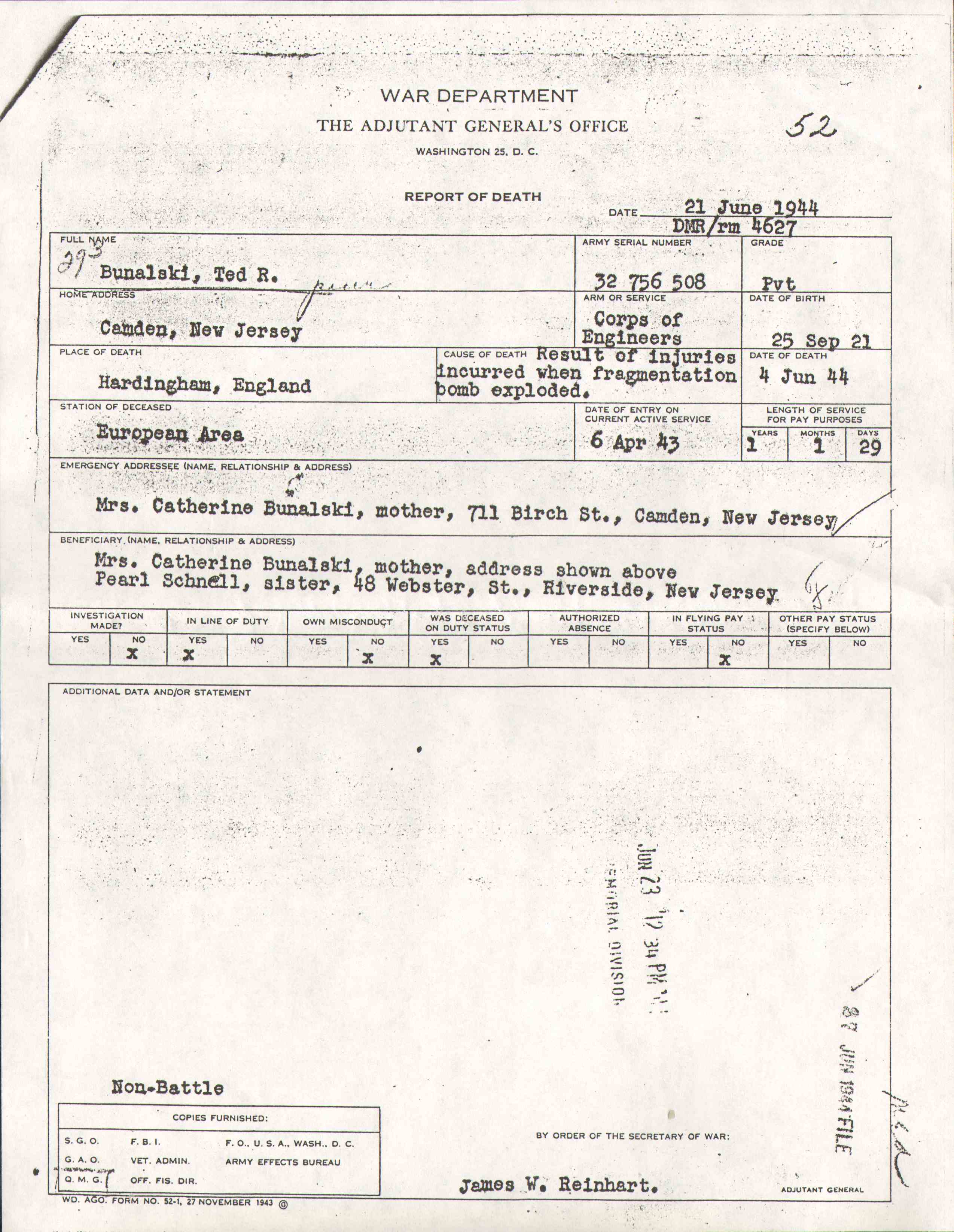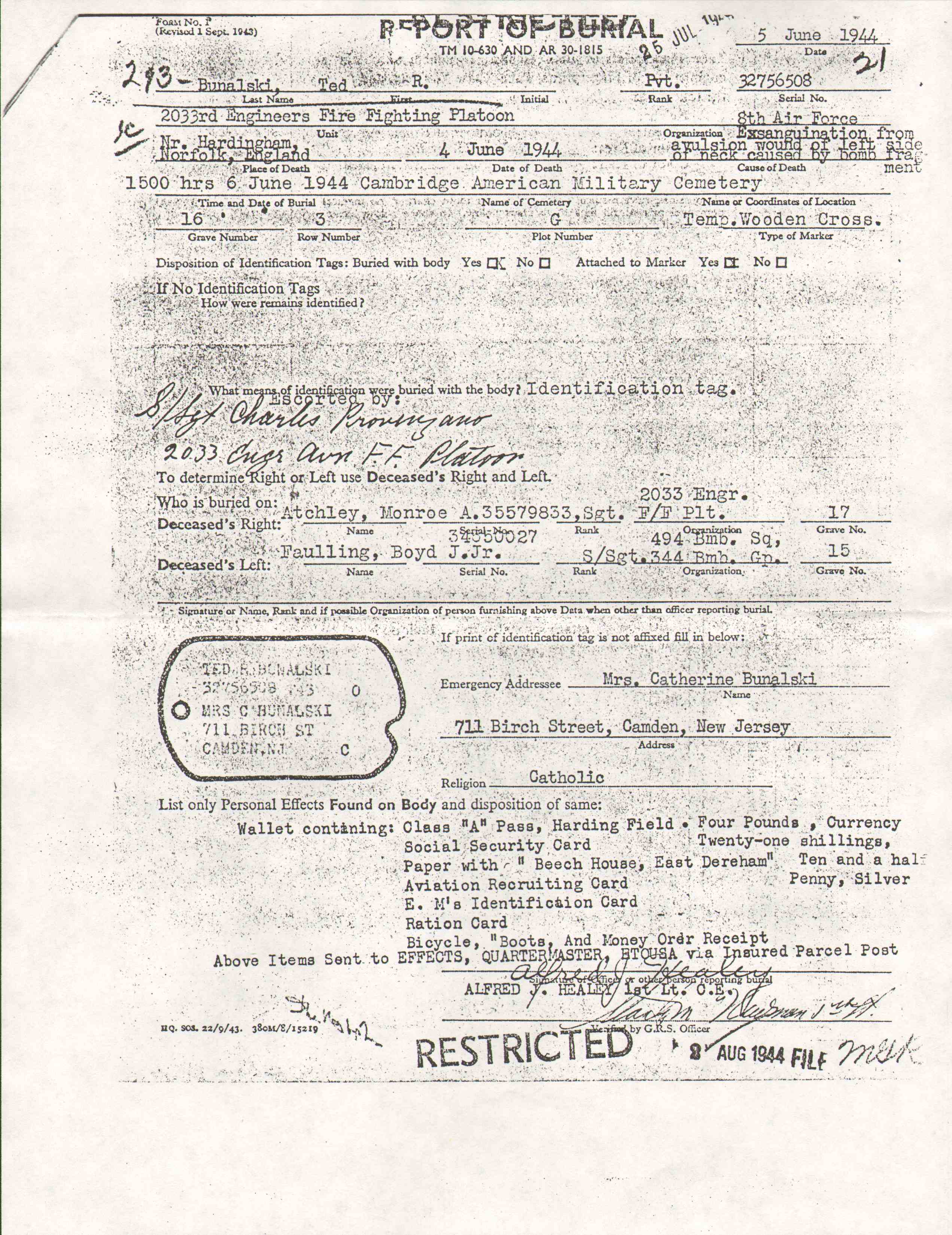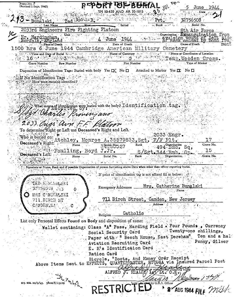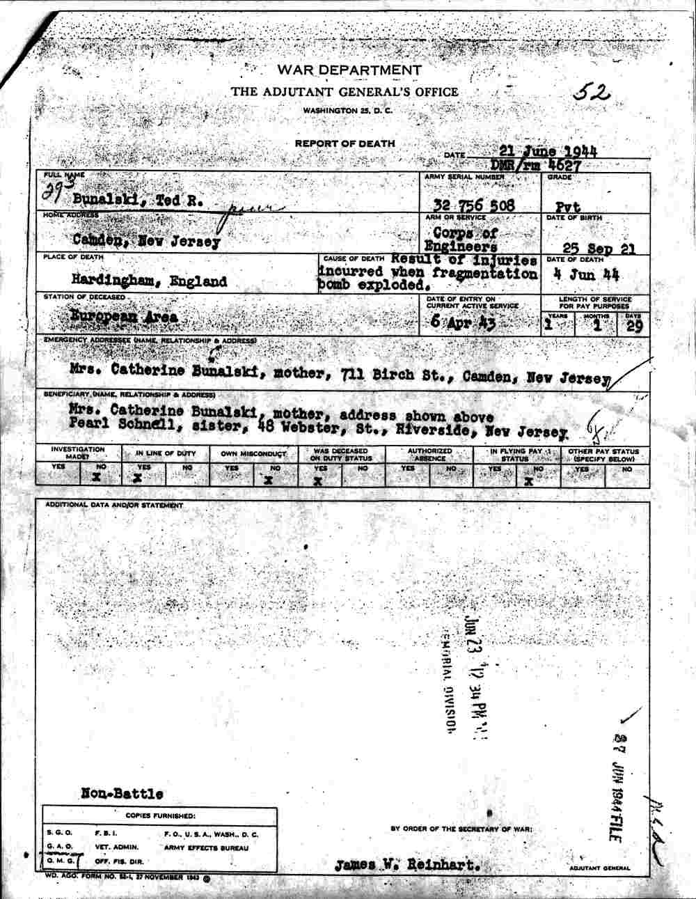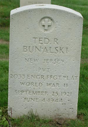 PRIVATE TED R. BUNALSKI was born on September 5, 1921. He had lived with his mother at 711 Birch Street in Camden NJ. He graduated from Woodrow Wilson High School in Camden NJ, where he was a star football player, and participated other sports and school activities. After graduating from high school he took a job at the New York Shipbuilding Corporation shipyard in Camden. Ted Bunalski was inducted into the Army on April 6, 1943. After basic training, Private Bunalski was assigned to the 2033rd Engineers Fire Fighting Platoon, which was attached to the 44th Bomber Group. Crossing the ocean on HMS Queen Mary, his unit served at the aerodrome near Shipdham, England. The 2033rd Engineers Fire Fighting Platoon was responsible for extinguishing fires that occurred when planes crashed. This was very hazardous work, due to the bombs, ammunition, and fuel on the aircraft. The British government furnished them platoon with what one platoon member described as "an antiquated fire truck that had a large tank of water and foam to fight plane fires. Most fields in England had a small pond… and we were able to suck water out of these ponds to fight planes fires off the airdrome with our available equipment." The aircraft engines also had magnesium in them which was impossible to put out once ignited. The engines would have to be separated from the burning aircraft and be allowed to burn themselves out. On the evening of June 4, 1944, a B-24 Liberator bomber of the 856th Bomber Squadron, 492nd Bomber Group, piloted by Second Lieutenant Raymond J. Sachtleben crashed into an unoccupied house at approximately 5:30 PM local time at Hardingham, near Garveston, Norfolk, England killing all ten men in the crew. Private Bunalski and Sergeant Monroe A. Atchley of Anderson IN were eating dinner when they heard men yelling that a plane had crashed. They left their meals, ran out on the road, and jumped on the first truck going to the fire. Joined by other members of the platoon, led by Staff Sergeant Charles Provenzano, upon arrival at the crash site they immediately went to the burning plane and proceeded to extinguish the flames, disregarding the danger of bombs and a gas tank which was burning and full of gasoline. The plane was loaded with Model 201b fragmentation bombs, and while the fire was being combated, a bomb exploded. Sergeant Atchley was killed instantly. Private Bunalski received multiple shrapnel wounds, and a severe wound to the left side of his neck, which caused him to bleed to death. With shells firing and bombs exploding, medics attempted to get to the wounded men, but were too late. The other members of the platoon continued to attempt to fight the fire until ordered away from the crash. Private Bunalski and Sgt Atchley were posthumously awarded the Soldiers medal for heroism. Staff Sergeant Provenzano was awarded the Bronze Star along with four other members of the 2033rd Fire Fighting Platoon, Sergeant Antonio M. Suplrizio, and Privates First Class Anton Bauo, Michael Lazarowicz, and John J. Schrack. Ted Bunalski was buried on June 5, 1944 at the Cambridge American Military Cemetery in England. In 1948 his body was returned to the United States, and he was buried on July 22nd of that year at the Beverly National Cemetery in Beverly NJ. Ted Bunalski was survived by his mother, and four sisters. |