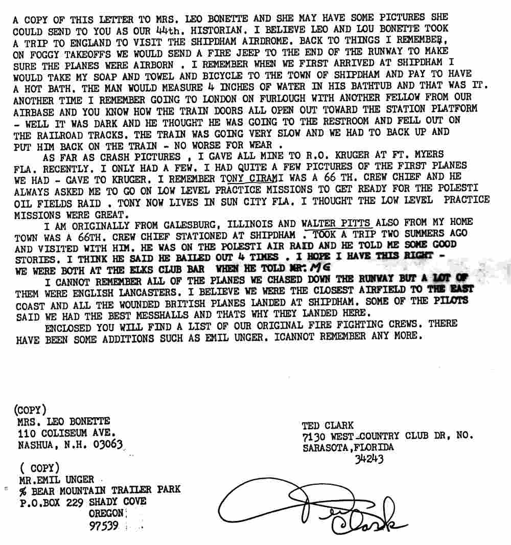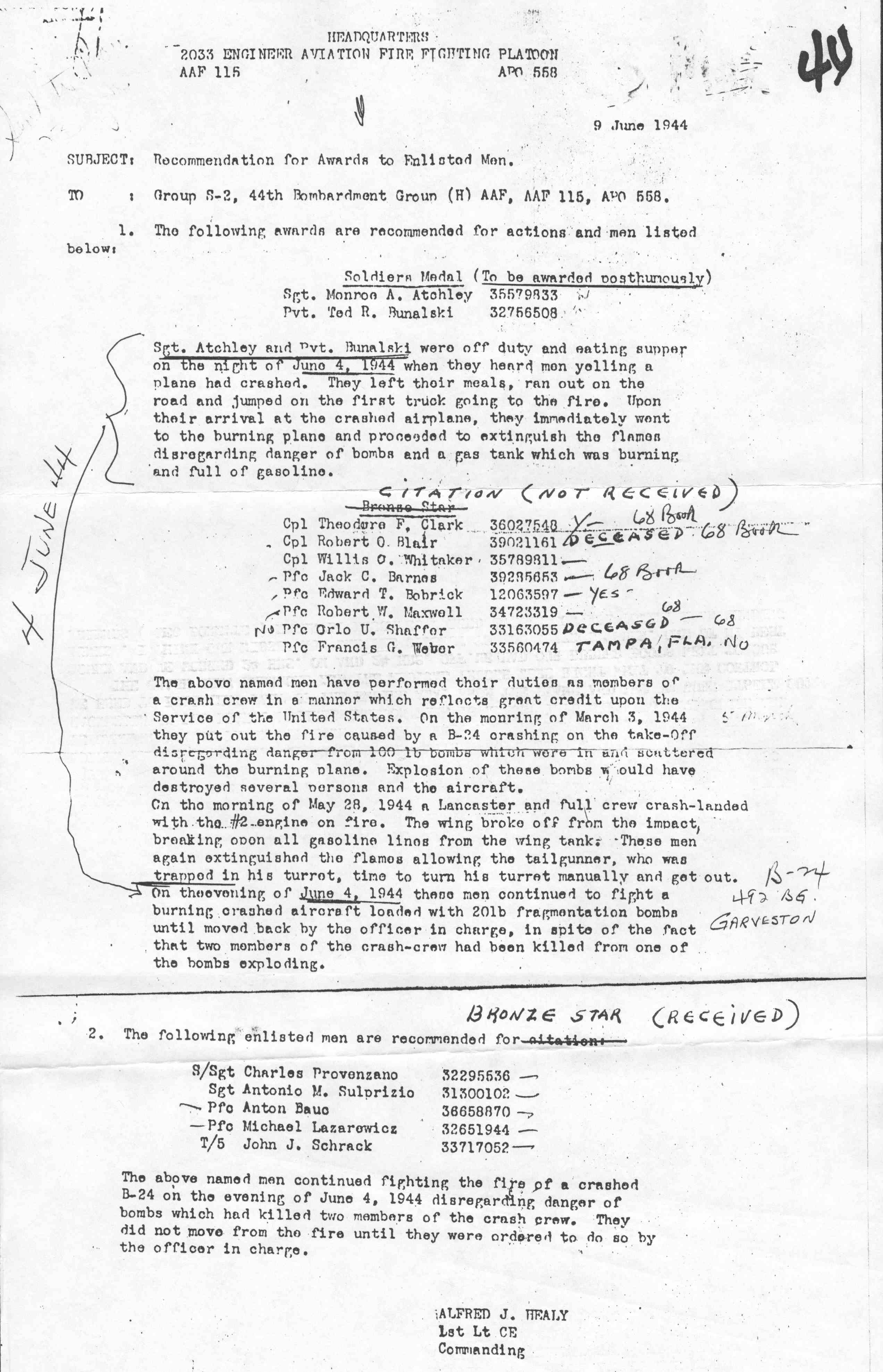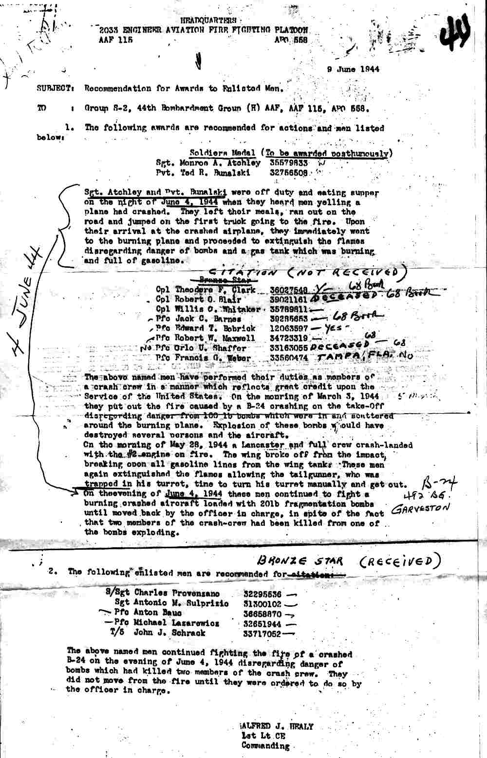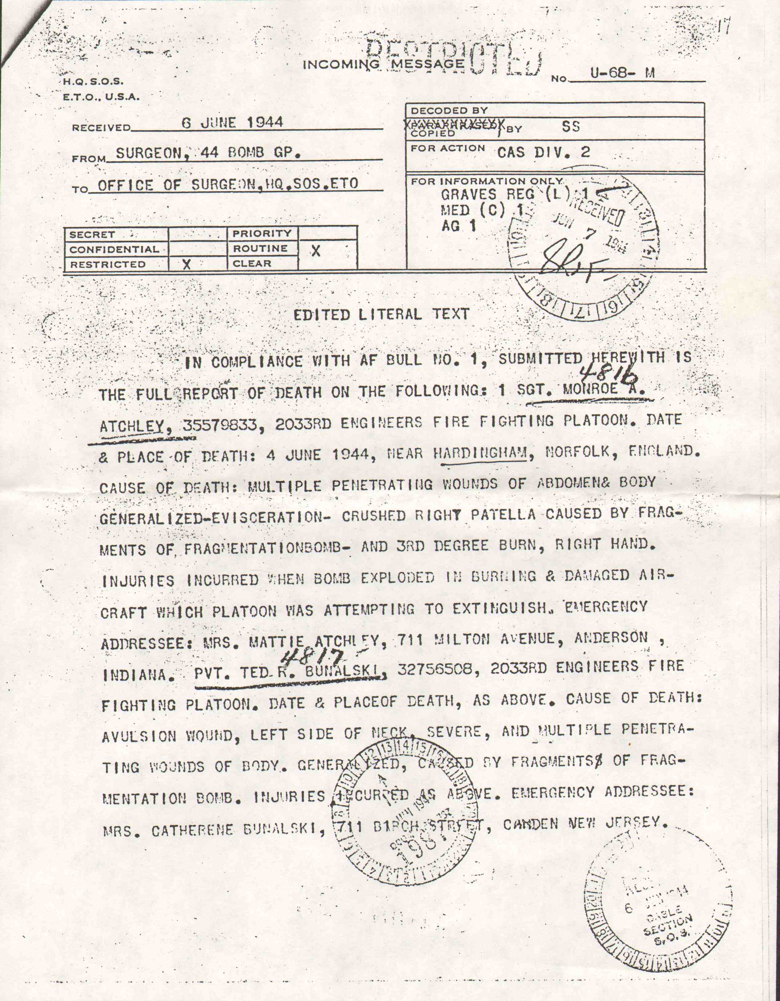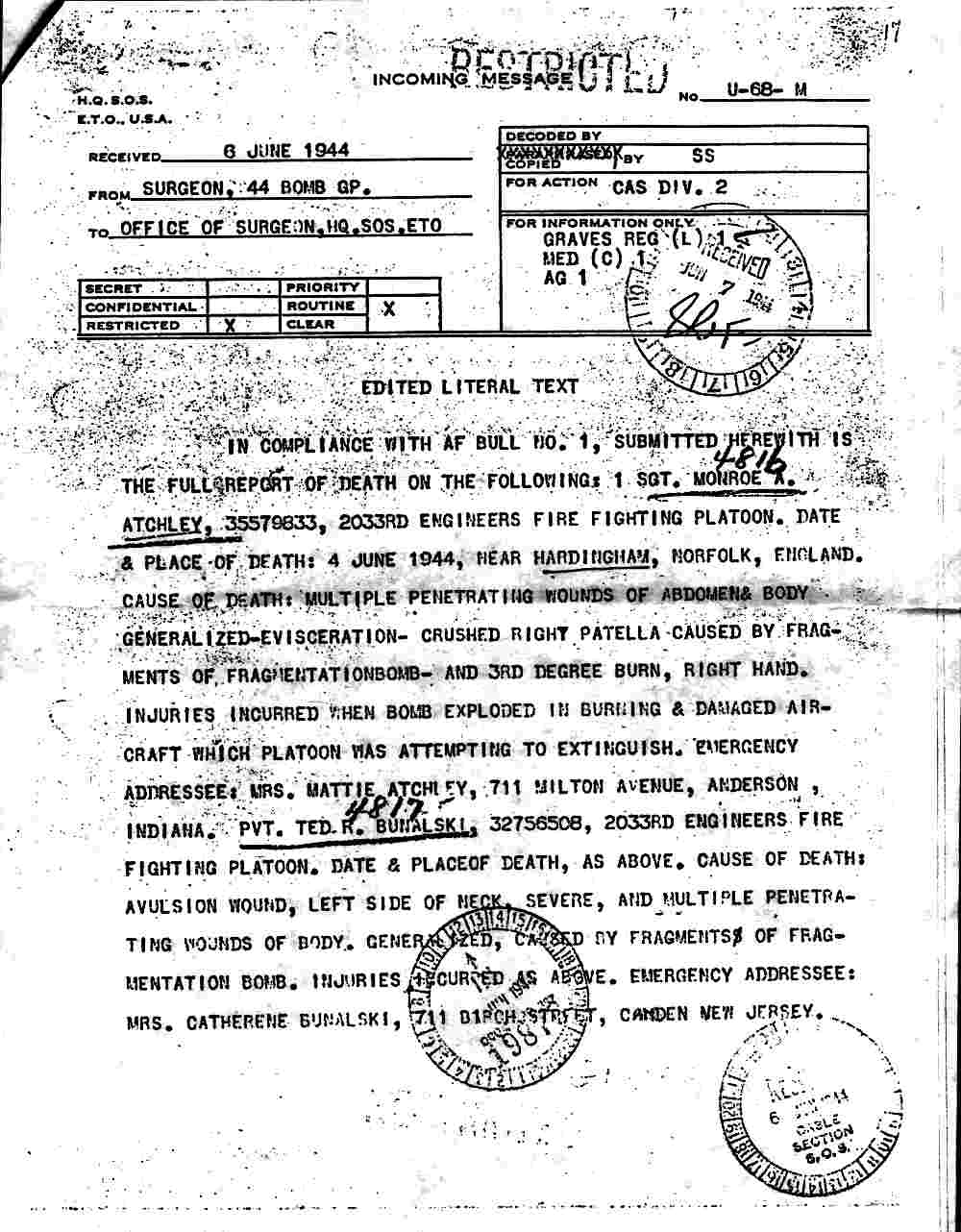 PRIVATE TED R. BUNALSKI was born on September 5, 1921. He had lived with his mother at 711 Birch Street in Camden NJ. He graduated from Woodrow Wilson High School in Camden NJ, where he was a star football player, and participated other sports and school activities. After graduating from high school he took a job at the New York Shipbuilding Corporation shipyard in Camden. Ted Bunalski was inducted into the Army on April 6, 1943. After basic training, Private Bunalski was assigned to the 2033rd Engineers Fire Fighting Platoon, which was attached to the 44th Bomber Group. Crossing the ocean on HMS Queen Mary, his unit served at the aerodrome near Shipdham, England. The 2033rd Engineers Fire Fighting Platoon was responsible for extinguishing fires that occurred when planes crashed. This was very hazardous work, due to the bombs, ammunition, and fuel on the aircraft. The British government furnished them platoon with what one platoon member described as "an antiquated fire truck that had a large tank of water and foam to fight plane fires. Most fields in England had a small pond… and we were able to suck water out of these ponds to fight planes fires off the airdrome with our available equipment." The aircraft engines also had magnesium in them which was impossible to put out once ignited. The engines would have to be separated from the burning aircraft and be allowed to burn themselves out. On the evening of June 4, 1944, a B-24 Liberator bomber of the 856th Bomber Squadron, 492nd Bomber Group, piloted by Second Lieutenant Raymond J. Sachtleben crashed into an unoccupied house at approximately 5:30 PM local time at Hardingham, near Garveston, Norfolk, England killing all ten men in the crew. Private Bunalski and Sergeant Monroe A. Atchley of Anderson IN were eating dinner when they heard men yelling that a plane had crashed. They left their meals, ran out on the road, and jumped on the first truck going to the fire. Joined by other members of the platoon, led by Staff Sergeant Charles Provenzano, upon arrival at the crash site they immediately went to the burning plane and proceeded to extinguish the flames, disregarding the danger of bombs and a gas tank which was burning and full of gasoline. The plane was loaded with Model 201b fragmentation bombs, and while the fire was being combated, a bomb exploded. Sergeant Atchley was killed instantly. Private Bunalski received multiple shrapnel wounds, and a severe wound to the left side of his neck, which caused him to bleed to death. With shells firing and bombs exploding, medics attempted to get to the wounded men, but were too late. The other members of the platoon continued to attempt to fight the fire until ordered away from the crash. Private Bunalski and Sgt Atchley were posthumously awarded the Soldiers medal for heroism. Staff Sergeant Provenzano was awarded the Bronze Star along with four other members of the 2033rd Fire Fighting Platoon, Sergeant Antonio M. Suplrizio, and Privates First Class Anton Bauo, Michael Lazarowicz, and John J. Schrack. Ted Bunalski was buried on June 5, 1944 at the Cambridge American Military Cemetery in England. In 1948 his body was returned to the United States, and he was buried on July 22nd of that year at the Beverly National Cemetery in Beverly NJ. Ted Bunalski was survived by his mother, and four sisters. |