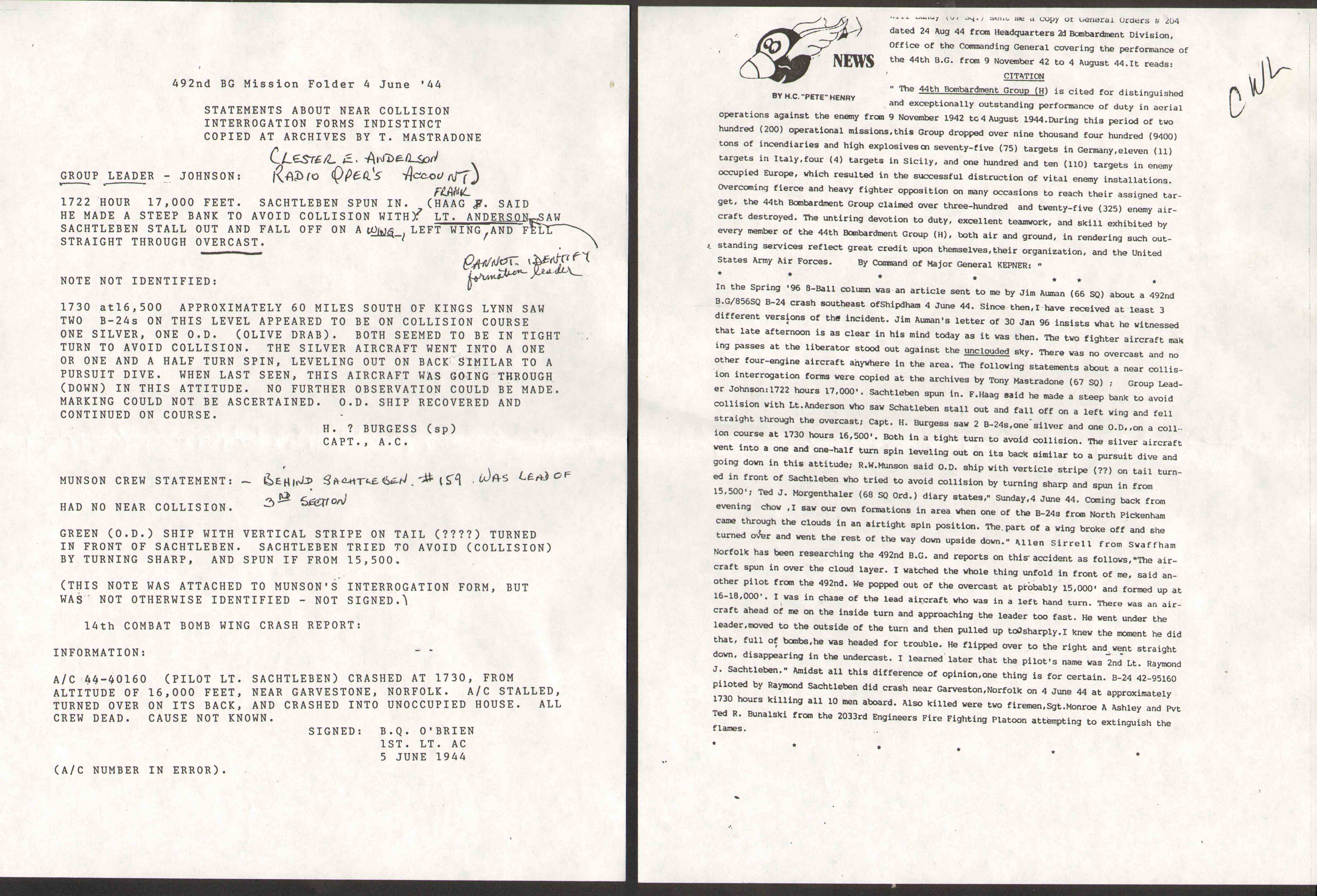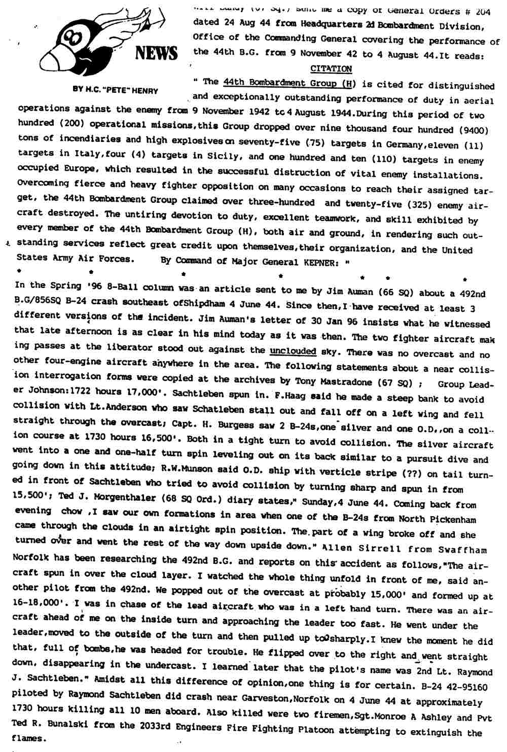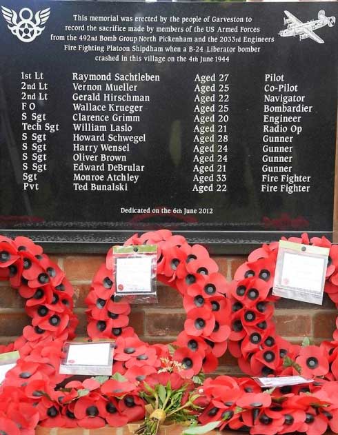 On June 4, 2012 the Village of Garveston, in Norfolkshire, England dedicated a memorial to the 12 American servicemen who were killed when a B-24 bomber crashed there on June 4, 1944. |