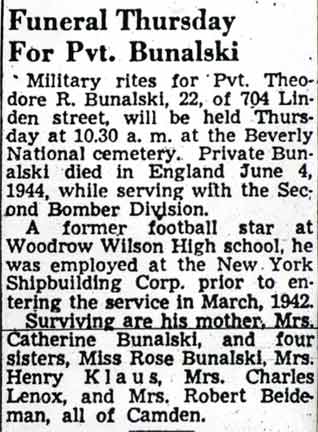 bomb in England, according to army and navy announcements. Bunalski, son of Mrs. Catherine Bunalski, was killed June 4 at Hardingham England when a bomb exploded in a burning plane which his platoon was trying to extinguish. He joined the Army in April, 1943, and had been overseas about six months. He formerly was employed at the New York Shipyard. Woodrow Wilson Star
