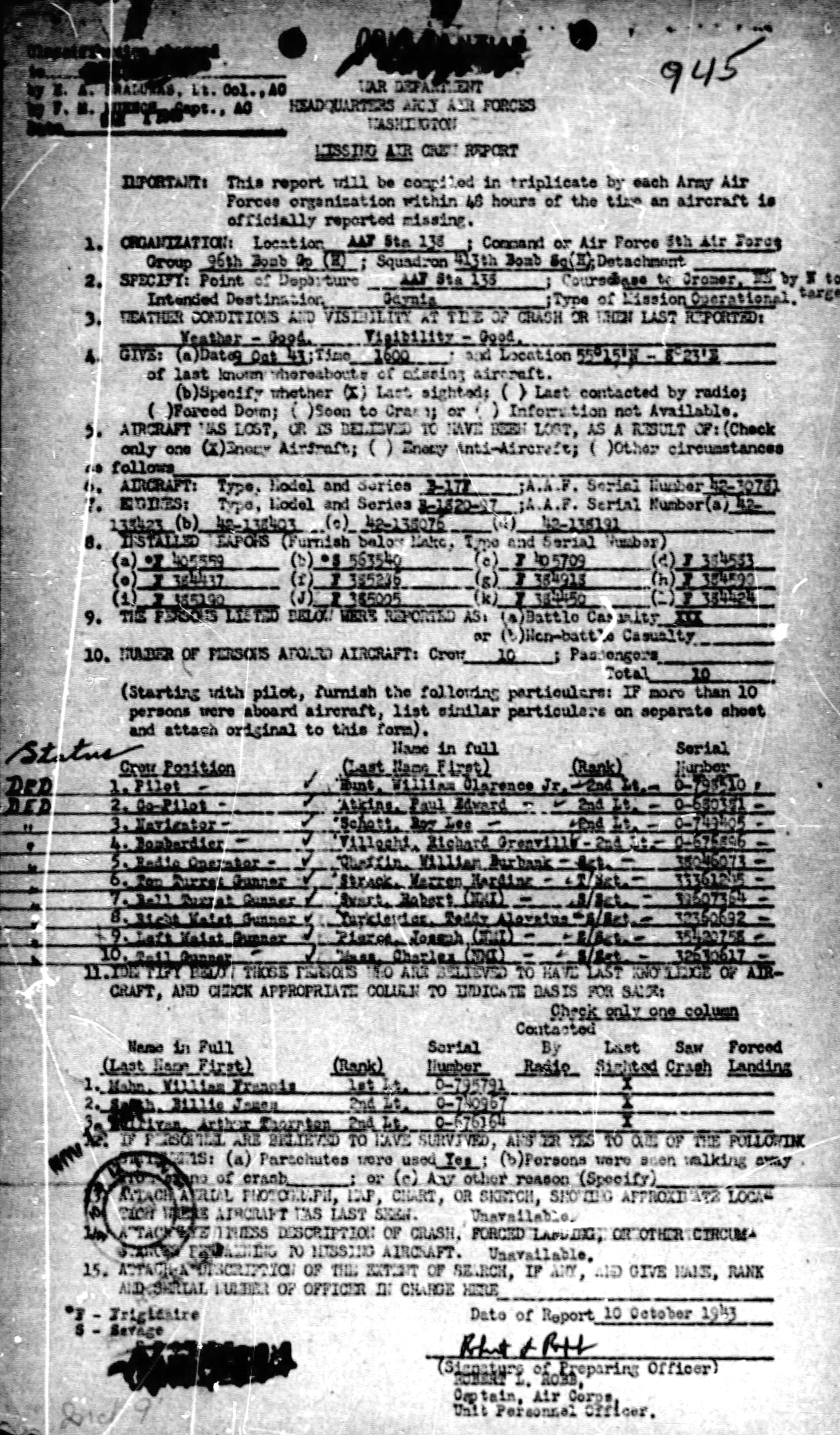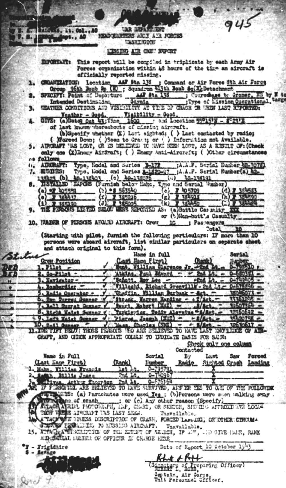 STAFF SERGEANT THADDEUS YURKIEWICZ born in New Jersey in 1921, the son of Aloysius and Stella Yurkiewicz. Nicknamed "Yurkie", he grew up and attended school in Camden NJ, at the St. Joseph Parochial School, and the Henry J. Bonsall School. He graduated from Woodrow Wilson High School in June of 1940. Other members of his graduating class included Frank J. Blair, Tom Glennon, and Angelo DiCamillo. His induction records state that he worked as a machinist's helper prior to his military service. Teddy Yurkiewicz was drafted on August 26, 1942, and reported for active duty with the Army on September 8th, 1942. He qualified for flight duty. After attending Army schools in Florida, Texas, Arizona, and Washington he was sent to England, where he was a gunner aboard a B-17 Flying Fortress. He and the crew that he trained with were assigned to the 413th Bomber Squadron, 96th Bomber Group (Heavy), based at Snetterton, England Staff Sergeant Yurkiewicz was reported missing in action on October 9th, 1943, the day which British-based American planes flew across Europe to bomb what is now Pomerania, East Prussia, and other war centers in Northeastern Germany. He was aboard a B-17F with serial number 42-30781. His squadron was on an operational mission to bomb what is now Gdynia, Poland. The plane was attacked by German fighters on the way back to England and went down over the North Sea. Although parachutes were seen as the plane went down, there no survivors or bodies were recovered. The crew members were as follows: Crew members Staff Sergeant Yurkiewicz's death was reported in the October 25, 1943 edition of the Camden Courier-Post. He was survived by his parents, who moved after the war to West Palm Beach FL, and his sisters, Olga and Diana. Staff Sergeant Yurkiewicz was known to the Army Air Force as Teddy A. Yurkiewicz. He is memorialized on the plaque at St. Joseph Church, 10th and Mechanic Streets in Camden, and on the monument at Park Drive and Route 130 in Pennsauken NJ as Theodore A. Jurkiewicz. |