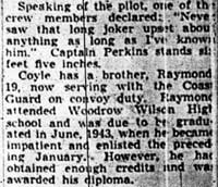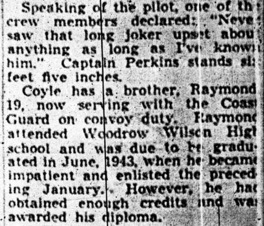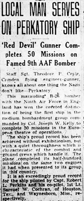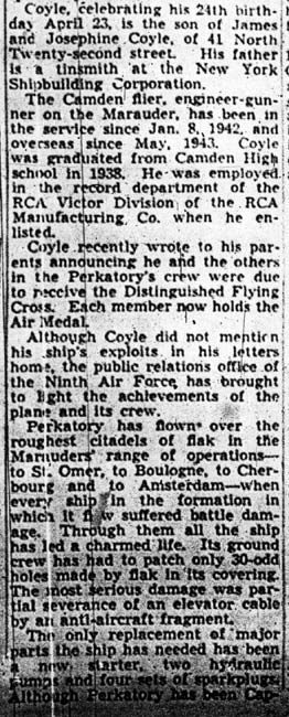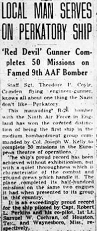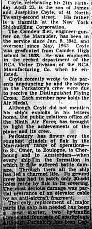 STAFF SERGEANT THEODORE P. COYLE was born in New Jersey April 23, 1920, the second of the three sons of James J. and Josephine Coyle. The Coyle family lived at 41 North 22nd Street in Camde3n NJ, where James Coyle in 1930 worked as a foreman at a radio factory. James Coyle later found work as a sheet metal worker at the New York Shipbuilding Corporation shipyard in Camden. Theodore Coyle was a 1938 graduate of Camden High School. He worked in the record department at the RCA-Victor plant in Camden NJ after graduation. Theodore Coyle enlisted in the United States Army on January 8, 1942. Once in the Army, Theodore Coyle qualified for flight duty, and trained as a flight engineer and gunner. After going overseas in the first half of 1943, he flew 65 missions before his plane failed to return from a flight originating from England on July 18, 1944. Staff Sergeant Coyle he was declared missing in action. Prior to being lost, Theodore Coyle had been awarded the Air Medal with Oak Cluster, and the Distinguished Flying Cross. The body of Theodore Coyle was recovered after the war, and he was reported as killed in the August 2, 1945 morning edition of the Camden Courier-Post. He rests in the Normandy American Cemetery at St. Laurent-sur-Mer, France. Theodore Coyle was survived by his parents, of the North 22nd Street address, and his brothers, Joseph and Raymond. |