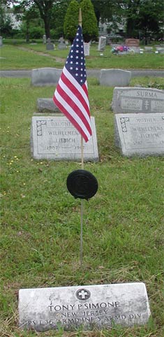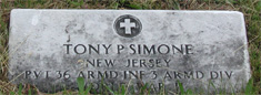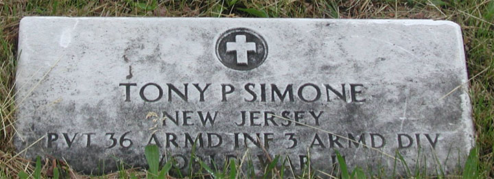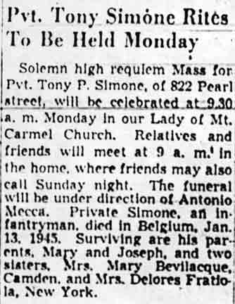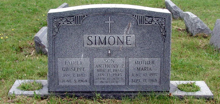 PRIVATE TONY P. SIMONE was born November 11, 1924. He lived at 822 Pearl Street, Camden NJ. Private Simone was killed in action while serving in Belgium with the Medical Detachment of the 36th Armored Infantry Regiment, 3rd Armored Division on January 13, 1945. He was survived by his parents, Mr. and Mrs. Giuseppe and Maria Simone, of the Pearl Street address, and two sisters. Tony Simone was brought home after the war. He was buried at New Camden Cemetery in Camden NJ on May 24, 1948, where he today rests by his parents. |