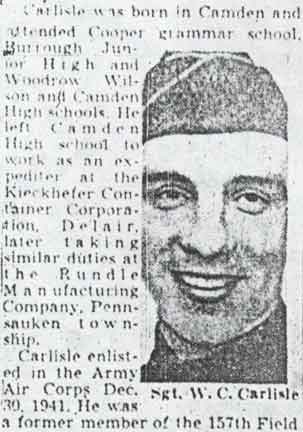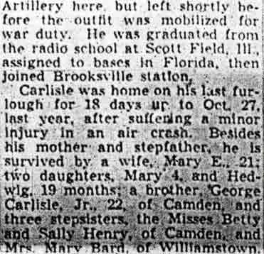 FLIER DIES WITH 8 IN CRASH A Camden man was among nine crew members who were killed when two Flying Fortresses collided and crashed early yesterday about 10 miles south of Brooksville Army Air Field, Florida. Brigadier General Peabody, commander of the Army Air Forces at Orlando FL said both planes were on combat training missions. The Camden man is Staff Sergeant William C. Carlisle, 24, of 526 North 6th Street, son of Mrs. George Henry. He was a radio operator. Carlisle was born in Camden and attended the Cooper grammar school, Burrough Junior High, and both Woodrow Wilson and Camden High Schools. He left Camden High School to work as an expediter at the Kieckhefer Container Corporation, Delair NJ, later taking similar duties at the Rundle Manufacturing Company, Pennsauken Township. Carlisle enlisted in the Army Air Corps December 30, 1941. He was a former member of the 157th Field Artillery in Camden NJ, but left shortly before the outfit was mobilized for war duty. He was graduated from the radio school at Scott Field IL, assigned to bases in FL, then joined Brookville station. Carlisle was home on his last furlough for 18 days up to October 27, 1943, after suffering a minor injury in an air crash. Besides his mother and stepfather, he is survived by a wife, Mary E., 21; two daughters, Mary 4, and Hedwig, 19 months; a brother, George Carlisle Jr., 22, of Camden, and three stepsisters, the Misses Betty and Sally Henry, of Camden, and Mrs. Mary Bard, of Williamstown. |