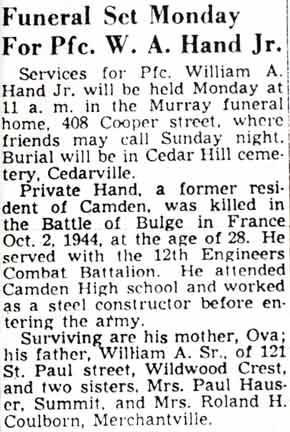 PRIVATE FIRST CLASS WILLIAM A. HAND, JR., was born in Camden NJ in 1917 to William and Ava Hand. He was the third child, coming after sisters Margaret and Beryl. William Hand Sr. worked as a railroad locomotive engineer. William Hand Jr. attended Camden High School, and worked as an iron constructor before the war. He was inducted into the Army in February of 1941. William A. Hand Jr. was killed in action on October 2, 1944 serving with the 12th Engineer Combat Battalion, in support of the 8th Infantry Division. He was survived by his parents, of Fortescue NJ, and older sisters Mrs. Roland Coulborn and Mrs. Paul Houser, both of Summit NJ. After the War, William Hand was brought home to New Jersey. He was buried at Cedar Hill Cemetery in Cedarville NJ. |