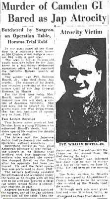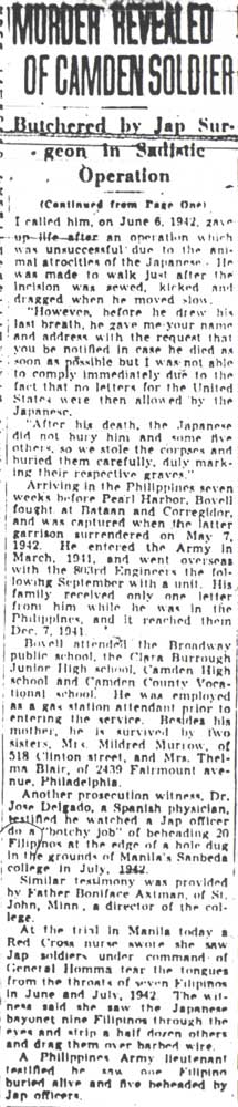 PRIVATE WILLIAM H. BOVELL JR. was born in 1918 to William H. and May Bovell in Camden, New Jersey. William H. Bovell Jr. appears to been the grandson of William Bovell who had been a private during the Civil War in the 183rd Pennsylvania Infantry. He was awarded a disability pension after the Civil War, and with his wife Rebecca operated a grocery till at least 1891 at 1700 Fillmore Street in Camden NJ. A member of Thomas M.K. Lee Post No. 5 of the Grand Army of the Republic, William Bovell passed away in 1900, when Rebecca Bovell signed for her widows pension. The Camden Directories in the years 1887 through 1891 show two other Bovells in the neighborhood of 1700 Fillmore Street. A Charles D. Bovell was a shoemaker at 1621 Fillmore, and a Harry S. (or Henry S.) Bovell worked as a letter carrier, and lived at 508 Jackson Street. These appear to be sons of William Bovell. William H. Bovell Sr. was born in 1881 in New Jersey, most probably a younger son of William and Rebecca Bovell. He had married May Lavinia Blinzinger by 1903, when daughter Mildred was born. Two other daughters followed, Thelma and Emily, and William H. Bovell Jr. was born in January of 1918. By that time the family was living at 516 Clinton Street, where they would remain through the mid 1940s. In 1920 William Bovell Sr. was working as a ship joiner in one of the local shipyards. He later found work as a wood finisher in a furniture store, possibly that of J.B. Van Sciver. Mother-in-law Sara Blinzinger lived with the Bovells. By 1930 Mildred and Emily Bovell had moved on, and daughter Emily had married Clarence Murrow. The household at that time included Mr. and Mrs.. Bovell, William Jr., Clarence and Emily Murrow, and their two children, William B. and Doris Murrow. William Bovell attended the Broadway Elementary School, Clara Burrough Junior High School, Camden High School, and the Camden County Vocational School. he was working as a gas station attendant when inducted into the Army in March of 1941 After undergoing basic training, William Bovell was assigned to the 803rd Engineer Battalion, Aviation, and sent to the Philippines in September. He only wrote home once, the letter reaching his family in December of 1941. Private Bovell was serving on Bataan when the Japanese attacked the Philippines in December of 1941. Taken prisoner by the Japanese, he was imprisoned at the Bilibid Prison in Manila when the islands fell in May of 1942. While imprisoned at Bilibid, William Bovell suffered an attack of appendicitis in June of 1942. Operated on without anesthetic by Japanese doctors, he was pushed off the operating table and forced to walk immediately after the operation. He died as a direct result of this maltreatment by the Japanese on June 16, 1942. The circumstances of his death were revealed during the war crimes trial of Japanese General Homma. Private Bovell was survived by his mother of 516 Clinton Street, and his two sisters, Mrs. Mildred Murrow of 518 Clinton Street and Mrs. Thelma Blair of Philadelphia. |