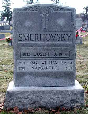 TECHNICAL SERGEANT WILLIAM SMERHOVSKY was born in 1921 in Camden NJ, the son of Joseph and Margaret Smerhovsky. Joseph, born in Philadelphia in 1895, was the son of a Bohemian tinsmith, who been in Philadelphia by 1890. By 1920 the family was renting a home for $16.00 a month at 1243 South 3rd Street in Camden NJ, and Joseph was working as an electrician at the Baldwin Locomotive Works. The family later moved to 348 Atlantic Avenue, Camden NJ. William was the middle child, coming after Anna and before Elizabeth. He attended the Church of the Sacred Heart parochial school at Broadway and Ferry Avenue and the Camden County Vocational School on Browning Road in Pennsauken NJ, from which he graduated in 1939. Prior to entering the Army, he had been employed at the Levering and Reibel Plant in Camden NJ. William Smerhovsky was inducted into the Army in June of 1943. William Smerhovsky was serving at Fort Bragg NC on January 16, 1944 when his father passed away. He was sent overseas in October of that year, with Company C, 397th Infantry Regiment, 100th Infantry Division. Also serving with that unit was Private William F. Donehower, of Westmont NJ. On November 22, 1944 William Smerhovsky was killed in action, according to the Camden Courier-Post January 3, 1945 morning edition. He was survived by his mother, who passed away in 1981, and his two sisters. Technical Sergeant Smerhovsky was awarded the Silver Star posthumously for his actions at Senones, France. After the war, William Smerhovsky was brought home to New Jersey. He was buried next to his father at Calvary Cemetery in Delaware Township (present-day Cherry Hill) NJ. Margaret Smerhovsky joined them in 1981. |