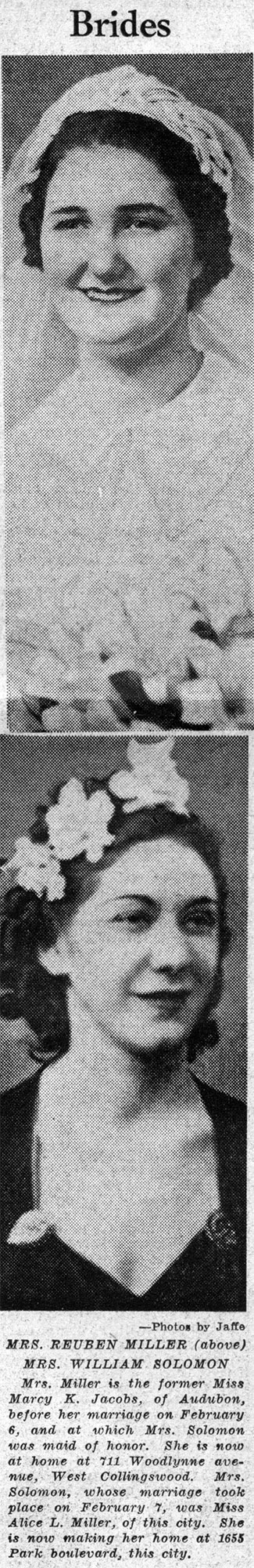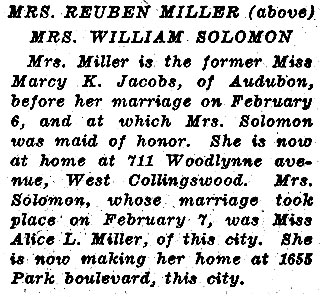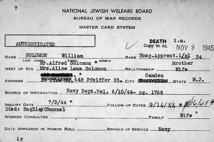 HOSPITAL APPRENTICE FIRST CLASS WILLIAM SOLOMON was born on March 12, 1910. He lived in Collingswood for many years. On February 7, 1938 he married Alice Miller. The Solomons live at 1655 Park Boulevard in the Parkside section of Camden, New Jersey after they wed, before moving to 448 Pfeiffer Street in East Camden. Prior to entering the Navy in the summer of 1943, William H. Solomon was employed by the New York Shipbuilding Company in Camden as a steelworker. William H. Solomon was killed in action on April 28, 1944. Available recrds indicate that he was in the English Channel at the time of his death. William H. Solomon was survived by his wife, Alice Lena Solomon, and a 15 month-old daughter, Rebecca Ann. They were living at 15 Pine Street in Westville, New Jersey when he died. |