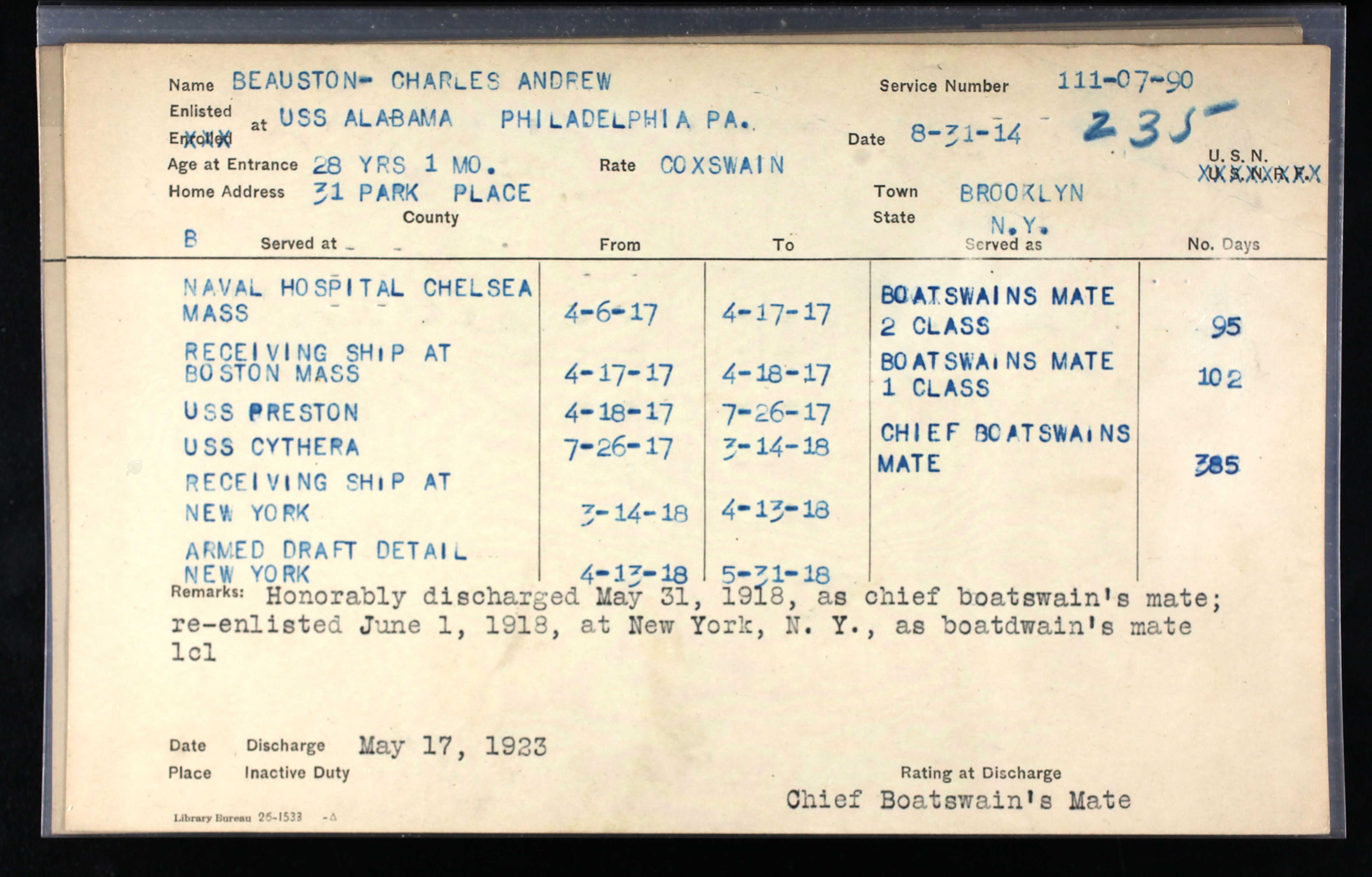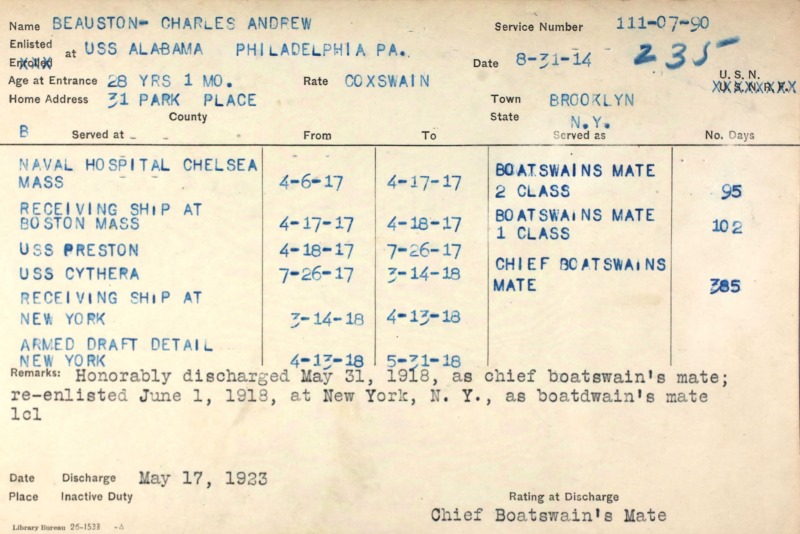 CHIEF BOATSWAINS MATE CHARLES ANDREW BEAUSTON was born on July 31, 1886 in Detroit, Michigan to John Beauston and his wife, the former Amelia Griffin. He joined the United States Navy as a young man, and was aboard the USS Louisiana (BB-19) in 1907 when that ship, as part of President Theodore Roosevelt's Great White Fleet, sailed around the world. Chief Beauston retired from the Navy around 1923, then went into the United States Naval Reserve. The April 1930 Census shows Charles Beauston and his wife, the former Rose Griffin, living in Jersey City, New Jersey and working as a bank guard. Later that year, when the 1931 Camden City Directory was compiled, he was living at 155 Eutaw Avenue in Camden and was working as a bank guard in Philadelphia. He later settled in Waterford Township NJ. He remained a member of the United States Naval Reserve. Charles Beauston was called back to service in December 1941, just after Pearl Harbor was attacked. He was taken ill while on active duty, and was discharged in June of 1942. Chief Beauston died in December of 1942. His death was reported in the December 17, 1942 edition of the Camden Courier-Post. Survived by his wife Rose, he was buried at New Camden Cemetery in Camden NJ on December 19, 1942. Mrs. Beauston later moved back to Camden, and was living at 3300 River Avenue in Cramer Hill when the 1947 City Directory was compiled. |