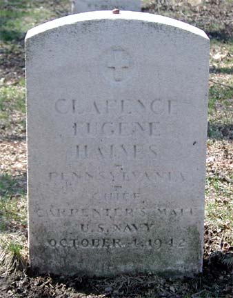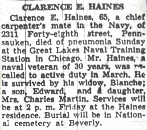 CHIEF CARPENTER'S MATE CLARENCE EUGENE HAINES was born in Wisconsin in 1887. He joined the United States Navy as a boy, serving in the Spanish-American War and World War I. By 1915 he had married his first wife, Lollie, a native of Virginia. Son Edward F. was born in 1915, and daughter Laura came along in 1918. Clarence Haines was still in the Navy at the time of the 1920 census, stationed at the Philadelphia Navy Yard as a carpenter. By April of 1930 Clarence Haines and family had moved to Pennsauken NJ. He had purchased a home at 2327 48th Street, and was working as a carpenter. By this time Lollie Haines had passed away. Clarence Haines remarried at some point after the census, and with his wife Blanche, had moved three doors to 2311 48th Street. He had retired from active duty in the Navy after serving 30 years. He was a member of American Legion Pennsauken Post 125 and the Gross-Hollingshead VFW Post 1270 in Pennsauken. Chief Haines was recalled to active duty in March of 1942. He was assigned to the Great Lakes Naval Training Center in Illinois. On October 4, 1942 Chief Carpenter's Mate Clarence E. Haines died of pneumonia at the Great Lakes base. His death was reported in the October 6, 1942 edition of the Camden Courier-Post. Clarence Haines was survived by his wife Blanche, son Edward F. Haines, and daughter, Mrs. Laura Martin. He was brought home to new Jersey, and was buried at Beverly National Cemetery in Beverly NJ on October 9, 1942. |