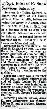 TECHNICIAN FIFTH CLASS EDWARD R. SNOW was born to Charles E. and Lillian Snow in New Jersey in 1914. He had an older brother, Charles R. Snow. The Snow family made its home at 3421 Highland Avenue in Camden, New Jersey. In 1930 his father and brother both worked in Camden's shipyards, as a time keeper and an electrician respectively. Edward Snow was a 1931 graduate of Camden High School, he had been a mailman in Camden and Merchantville for 7 years prior to his induction, and had also been active in Masonic activities within the city. With his wife Anna, he made his home at 714 Curtis avenue in Merchantville NJ. Edward R. Snow was inducted into the U.S. Army in August of 1943. He reported to Veterans Memorial High School in Camden NJ at 9:00 AM on August 21st with other local men, and left for Fort Dix NJ. He went overseas to England in November of 1943 to serve in a postal unit. He was transferred to an Infantry outfit in July of 1944, and died of a heart ailment while training on February 12, 1945. Technician Fifth Class Edward R. Snow was survived by his wife, the former Anna E. Comerford, and his parents, Mr. and Mrs. Charles E. Snow of 3421 Highland Avenue, Camden NJ. |