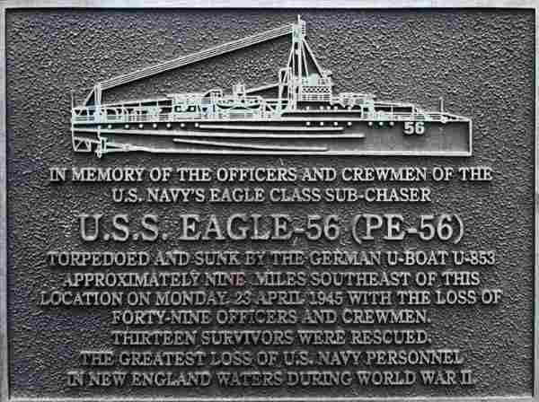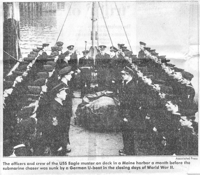 July 21, 2019 Divers have discovered the wreck of the last U.S. Navy warship sunk by a German submarine during World War II. Patrol boat USS Eagle PE-56 was located by a private dive team just a few miles off the Maine coast. The discovery ends a 74-year mystery about the ship�s location. The sinking of the USS Eagle PE-56 on April 23, 1945, was originally blamed on a boiler explosion. But the Navy determined in 2001 that it had been sunk by a German submarine. Garry Kozak, a specialist in undersea searches, announced this week that diver Ryan King, of Brentwood, N.H., confirmed in June 2018 that an object Kozak previously discovered on sonar is the vessel 300 feet down. King's team, which later began working with the Smithsonian Channel, extensively explored the ship on the ocean floor, five miles off Cape Elizabeth, Maine. The Naval Historical Center notes that Eagle was towing targets for Navy dive bombers when she was sunk by the German U-853. Her sinking came just two weeks before V-E Day. Only 13 of the 62 crew members survived; they were plucked from the