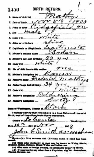 CHIEF MACHINIST'S MATE EDWIN FREDERICK MATHYS was born on November 5, 1903 to Frederick and Sarah Mathys in Washington. His father had emigrated from Switzerland and eventually had enlisted in the United States Army, where he served for twenty-five years. Frederick Mathys was serving at Mobile AL when his fiance, 18 year old Sarah Soden, traveled east from Washington to marry him on March 19, 1902. Sarah Mathys returned to her parents' home to give birth. Sometime thereafter, the family was reunited at Fort Brady MI where daughter Katy Beatrice Mathys was born, on January 2, 1906. After Frederick Mathys left the Army, the family settled in Vancouver WA, where younger brother Harry Edson Mathys was born on February 2, 1915. By 1920 family had purchased a home in Vancouver, Washington, and Edwin Mathys attended Vancouver High School in Vancouver, Clark County, Washington.