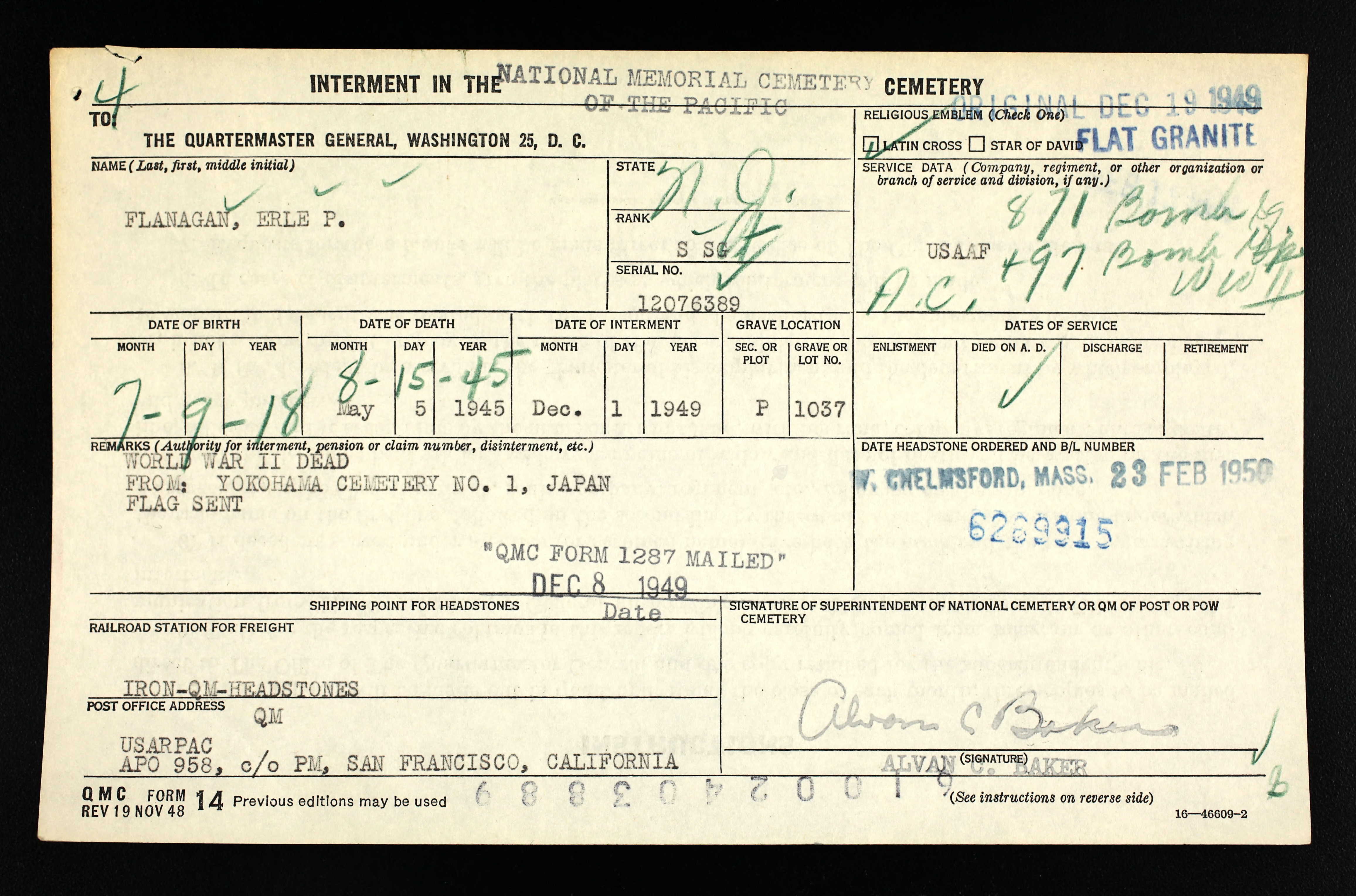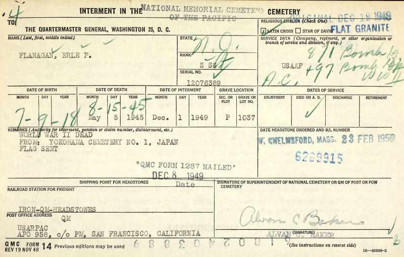 STAFF SERGEANT ERLE PATRICK FLANAGAN was born in Pennsylvania to Edgar J. and Margaret J. Flanagan. Army records show his birthday to be July 9, 1918, however an inscription on his parents tombstone gives his year of birth as 1917. The 1920 Census shows the family living in Philadelphia, Pennsylvania. By 1930 the family, which included brother Edgar Jr. and sister Doris, owned a home at 400 Nicholson Road in Audubon NJ. Edgar Flanagan Sr. was working as the Superintendent of Service Stations for a gasoline company. The family later moved to 219 South Logan Avenue in Audubon. The 1940 Census shows him living in Haddon Heights, New Jersey with his wife, O. Doris Flanagan. He was then working as a meter reader, while his wife worked as an assembler at a radio factory. Erle Flanagan enlisted in the United States Army on October 17, 1942. He qualified for flight duty, and in November of 1943 was training at the Army Air Force Navigation School at San Marcos TX. Staff Sergeant Flanagan was assigned to the 871st Bomber Squadron, 497th Bomber Group, Very Heavy. The 497th was constituted as 497th Bombardment Group (Very Heavy) on November 19, 1943 and activated on November 20 at El Paso TX. On December 1, the group moved to Clovis NM and prepared for overseas duty with B-29's until April 13, 1944, when the unit moved to Pratt Army Air Field in Kansas. The group moved to Saipan in stages between July and October of 1944, and assigned to Twentieth Air Force. Based at Isley Field on Saipan, the unit began operations in October of 1944 with attacks against Iwo Jima and the Truk Islands. the 497th took part in the first attack on November 24 1944 on Japan by Army Air Force planes based in the Marianas, and flew many missions against strategic objectives in Japan; on numerous raids, the group made its attacks in daylight and from high altitude. The 497th received a Distinguished Unit Citation for a mission on January 27, 1945. On that day: although weather conditions prevented the group from bombing its primary objective, the unescorted B-29's withstood severe enemy attacks to strike an alternate target, the industrial area of Hamamatsu. The group was awarded second Distinguished Unit Citation for attacking strategic centers in Japan during July and August, 1945. The group assisted the assault on Okinawa in April 1945 by bombing enemy airfields to cut down air attacks against the invasion force. Beginning in March 1945 and continuing until the end of the war the group made incendiary raids against Japan, flying at night and at low altitude to bomb area targets. Staff Sergeant Flanagan Sergeant Flanagan