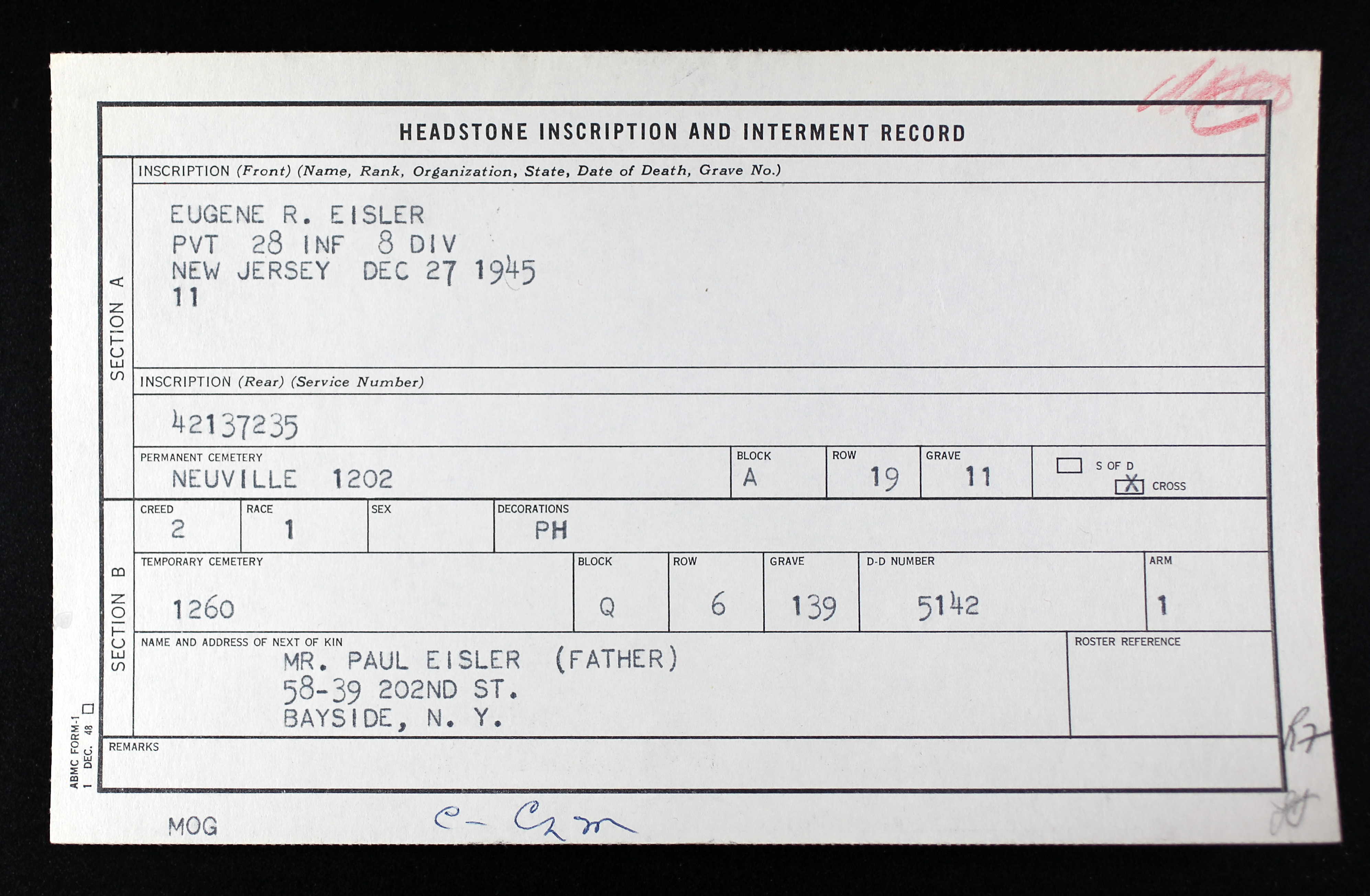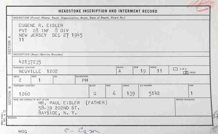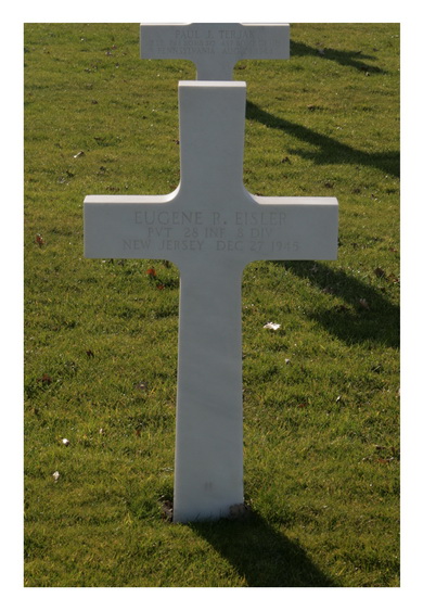 PRIVATE EUGENE R. EISLER was born in the state of New York in 1918 to Paul and Margaret Eisler. His youth is something of a mystery, as he appears to have lived apart from his parents at the time of the 1920 Census. They appear to have divorced at some point in the 1920s. Eugene Eisler's whereabouts in 1930 are undetermined. The 1940 Census shows Eugene Eisler living with his mother Margaret and her husband Fred Koch. Also living at the home was his older brother Paul, 27. Eugene Eisler was working, but his occupation was not specified. He had received three years of high school education and later worked as a skilled worker in manufacturing. The family lived in an apartment at 516 East 78th Street in Manhattan. At some point after the Census, Eugene Eisler established some ties to Camden, New Jersey, most likely through employment. Eugene R. Eisler was inducted into the United States Army on June 16, 1944 at Camp Upton, New York which was located near the town of Yaphank, on Long Island. He was assigned as a replacement with the the 28th Infantry Regiment, 8th Infantry Division. The 28th was suffered devastating casualties during the Battle of the Hurtgen Forest and in staving off German counter-attacks during the Battle of the Bulge, before withdrawing from combat for reorganization on December 15, 1945. Private Eisler was originally listed as missing in action and a determination was made on December 27, 1945 that he was dead. His body was later recovered and he was buried at the Ardennes American Cemetery at Neupre, Belgium per the instructions of his father, Paul Eisler, of Bayside, Queens County, New York. |