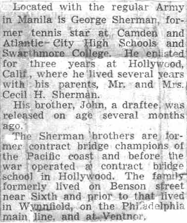 PRIVATE FIRST CLASS GEORGE C. SHERMAN was born in New York in 1906 to Mr. and Mrs. Cecil Harvey Sherman. In 1920 the family, which included younger brother John H., lived at 6243 Washington Avenue in Philadelphia PA. They soon after moved to Ventnor NJ, where George started high school at Atlantic City High. His maternal Aunt, Alice Deegan, married noted Camden journalist Dan McConnell during this time. The Sherman family moved once again, to Camden NJ, where George Sherman graduated from Camden High School in the middle 1920s. He was a star tennis player at both schools. George Sherman later attended Swarthmore College in Swarthmore PA. By April of 1930, the Sherman family had moved to Los Angeles CA, where they rented a home at 2003-3/4 Argyle Avenue. During this period George and John Sherman became the contract bridge champions of California, and operated a contract bridge academy in Hollywood for a time. In 1932 they brothers won a national bridge championship. George Sherman enlisted in the United States Army on February 22, 1941. His parents had relocated to 14 West Ridley Avenue in Ridley Park, Pennsylvania by that time. Private First Class Sherman was assigned to duty in the Philippine Islands. He was serving, along with Private First Class James W. Bramen, of Gibbsboro NJ, in the 808th Military Police Company, at Fort William McKinley in Manila in the fall of 1941. The 808th Military Police Company was one of the rare racially integrated units in the United States Army, with Filipinos and Americans serving side by side. The 808th, which had only 69 men in July of 1941, had its numbers increased to 160 by November 30th of that year. Private First Class Sherman spent a week in hospital while at Fort William McKinley in October of 1941. In December of 1941, immediately after the attack on Pearl Harbor, the Japanese invaded the Philippine Islands. Private Sherman survived the initial onslaught and took part in the desperate defense the United States forces mounted in the winter and spring of 1942. Cut off from any chance of reinforcement or re-supply, the American and Filipino soldiers, sailors, and airmen did what they could with what they had. Private First Class Sherman was reassigned to Company L, 31st Infantry Regiment. When the Japanese