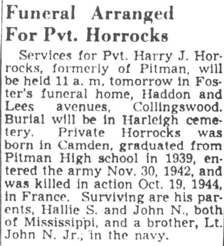 PRIVATE HARRY J. HORROCKS was born in Camden NJ to John N. and Hallie Horrocks on March 1, 1922. His father worked as a printer. By 1930 the family had moved to Mantua Township NJ, where they lived on Barnsboro-Pitman Road. Harry Horrocks graduated from Pitman High School in Pitman NJ in 1939. He enlisted in the United States Army on November 30, 1942. Private Harry Horrocks was killed in action in France on October 19, 1944. Harry Horrocks was brought home to New Jersey in 1948. He was buried at Harleigh Cemetery in Camden NJ on December 18th of that year. He was survived by his parents, who by then had moved to Mississippi, and his brother Lieutenamt John N. Horrocks Jr., United States Navy. |