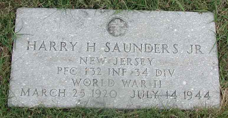 Division to rest and refit. Private First Class Harry H. Saunders Jr. was killed in action on July 14, 1944 when he stepped on a landmine during an attack on a pillbox on Bougainville. After the war, his body was brought home, and he was buried at Berlin Cemetery in Berlin NJ. His remains (his Mother always insisted, it was not his remains in the box) are buried at Berlin Cemetery in Berlin NJ. Apparently a mistake was made when preparing his tombstone, as the 34th Infantry Division was never in the South Pacific. |
