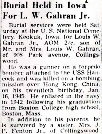 AVIATION ORDINANCEMAN SECOND CLASS LOUIS WILLIAM GAHRAN JR. was born in January 16, 1925 to Mr. and Mrs. Louis W. Gahran. He enlisted in the Navy in 1942 following his graduation Boston College High School in Boston MA. Louis Gahran qualified for naval flight duty and served as a gunner on an Avenger torpedo bomber. He was lost on his birthday, January 16, 1925 on a mission to bomb Japanese shipping in the harbor at Hong Kong. Louis Gahran was brought home after the war. He was buried at Keokuk IA on January 7, 1950. Louis William Gahran Jr. was survived by his parents, of 908 Park Avenue, Collingswood NJ. |