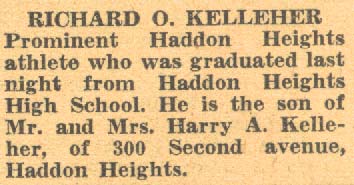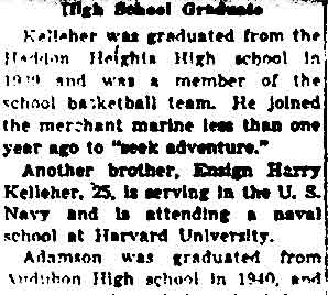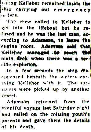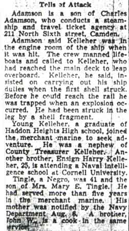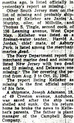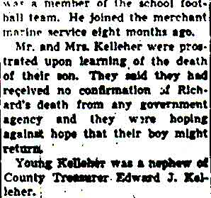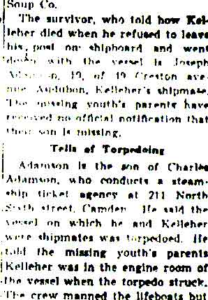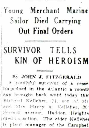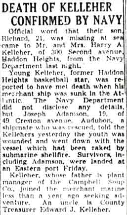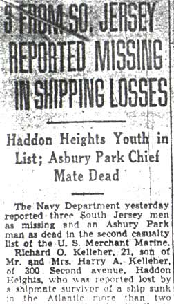 RICHARD OLIVER KELLEHER was born in 1921 in New Jersey to Harry A. and Ruth Kelleher. The Kelleher family had moved to New Jersey from Pennsylvania around 1918. In 1930 the family lived at 220 Logan Avenue in Audubon NJ, Harry Kelleher listing his employment for the Census as a salesman of food products, he later became plant manager for the Campbell Soup Company in Camden NJ. His uncle was Democrat Party activist Edward J. Kelleher, who was Camden County Treasurer from 1937 to 1943 and later served as the executive director of the Housing Authority of the City of Camden. They Kelleher family moved to 300 Second Avenue in neighboring Haddon Heights NJ sometime after the April 1930 federal census. Richard Kelleher graduated on June 13, 1939 from Haddon Heights High School, where he was a member of the basketball team. He joined the Merchant Marine around the time of Pearl Harbor to "seek adventure". Richard Oliver Kelleher was working in the engine room aboard the tanker SS Patrick J. Hurley as a fireman/water-tender when she was sunk on September 12, 1942. Also serving aboard aboard the Hurley was a boyhood friend, Joseph Adamson, of Audubon NJ. The Hurley was in the Caribbean when a German U-Boat surfaced and sank her with fire from the deck gun. On the night of 12 September 1942, U-512 commanded by Kptlt. Wolfgang Schultze, stealthily surfaced and closed the Hurley , undetected, before she opened fire with devastating effect. Armed guard commander Lieutenant Junior Grade Patrick Joseph Walsh fell severely wounded in the initial shelling, taking shrapnel in the throat. In spite of the withering machine-gun fire directed at his battle station on the bridge, Lieutenant Junior Grade Walsh remained at his post, though weak from loss of blood. For displaying selfless gallantry in battle, Walsh was posthumously awarded the Purple Heart and Silver Star medals. After the crew abandoned the doomed tanker, the SS Patrick J. Hurley - set ablaze in the South Atlantic by shell fire from a surfaced U-Boat - 22-year-old George Goldman of Jersey City watched from a lifeboat as the unmanned ship, engines still operating, steamed away and blew up in a fiery explosion on the horizon. "There were 23 of us in the boat," said Goldman, recalling that September day 56 years ago in World War II. "We looked for survivors, but the sea was too rough. You could hear whistles that were attached to their lifejackets, long high plaintive notes. We lost our captain, 13 crew members, and four Navy gunners. I can still hear those whistles blowing over the water." Survivor Joseph Adamson reported that Richard Kelleher remained at his station in the engine room to complete his duties before coming to the deck to abandon ship. Before he could reach the rail to leap overboard he was trapped when a shell exploded, wounding him in the leg. Joseph Adamson's brother, William Charles Adamson, was killed in North Africa while serving with the Army air Force in 1943. 13 of the drew, including Richard Kelleher, were lost, and four of the United States Navy sailors serving as armed guard aboard the Hurley . The U-512 had only 20 more days left herself. She was sunk October 2, 1942 north of Cayenne, French Guiana, in position 06.50N, 52.25W, by depth charges from an American B-18 A bomber. The B18, piloted by Lt. Lehti of the 99th Bombardment Squadron based at Zandery in Dutch Guiana, took off at midnight on October 2, 1942, and flew eastwards to its assigned patrol area along the French Guiana coast. At about 4:00 a.m., the radar operator advised Lehti that he had a contact at twelve miles. Lehti brought the aircraft down to three hundred feet and began his run in. At a mile, he was over a U-boat's wake, heading northwest. Within seconds, the boat was spotted moving very slowly and fully surfaced. The B-18 dropped lower and came boring in, dropping two depth-bombs as it crossed the U-boat. One 650 pound bomb entered the water ahead of the boat with another 325 pound bomb 30 feet further on. The U-boat, although obviously damaged by the blast, has disappeared by the time that Lehti could get his aircraft round for a second attack. Lehti turned his B-18 for the shore 120 miles distant, crossing over the prominent Cayenne lighthouse, he got a good check on his position. Re-crossing the lighthouse on a reciprocal course, he flew back towards the scene of the attack. Nine miles from the position of the previous attack, his radar operator advised that he had a contact at the original attack position. Lehti brought his bomber close to the water and ran in on the radar contact, catching the U-boat by surprise, once more on the surface. As the B-18 crossed the U-boat, Lehti released two 325 pound bombs simultaneously, both bombs plummeting into the water close alongside the U-boat. After the explosion, there was no sign of the boat. Lehti did not claim a kill on his arrival back at his base, but a B-18 was ordered to make a reconnaissance of the area at dawn. The reconnaissance aircraft found a large oil patch at the center of which was a man in a life jacket, the sole survivor of the sunken U-boat. The aircraft dropped a dinghy to the survivor and watched the exhausted man climb into it. The survivor was subsequently rescued by the USS Ellis after spending 10 days on a life raft which the aircraft dropped to his aid. The U-boat was later identified as the U-512. Of her crew of 51, there was only one survivor. The sole survivor, Matrosengefreiter Franz Machen, spent 10 days on a life raft which the aircraft dropped to his aid before being rescued by the US destroyer USS Ellis (DD-154). He survived partly by killing and eating seabirds that attacked him while he lay exposed on the raft. Richard O. Kelleher was survived by his parents, of the Haddon Heights address, older brother Harry A. Jr., older sister Ruth M., and a younger brother, Herbert D. Kelleher, who went on to become the founder and CEO of Southwest Airlines. His father passed away