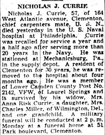 CHIEF CARPENTER'S MATE NICHOLAS J. CURRIE was born in 1886 in Pennsylvania. In 1905 he married Anna K, Risk, of Reading PA. He served for over 20 years in the United States Navy. According to the Camden Courier-Post he had made his home in Clementon NJ beginning about 1914, although census records seem to indicate otherwise. At the time of the 1920 census he actually was enumerated twice. He was counted in Philadelphia PA at the Naval base, and was working at the recruiting office. His wife was staying with her parents at 459 8th Avenue in Reading PA, and he is enumerated in reading as well. Being a World War I veteran, Nicholas Currie was a member of Lower Camden County Post 2142, Veterans of Foreign Wars, of Laurel Springs NJ. At the time of the 1930 census he was enumerated as "Nichols J. Curry" and living at 164 West Atlantic Avenue in Clementon NJ, working as a �chief inspector� in �government�. Along with wife Anna Currie, the Currie family at that time included daughter Celestine, then 19 and born in New Jersey, a nephew, Charles W. Forman, then a 27 year-old bus driver, and father-in-law Emil K. Risk, then 84, who had been born in Germany. Chief Currie was called back to active duty in November of 1942. he was stationed at a supply depot in Mechanicsburg PA. He took ill in mid-December of 1943, and was taken to the United States Naval Hospital in Philadelphia PA, where he died on April 13, 1944. His death was reported in the Camden Courier-Post on April 14, 1944. Nicholas Currie was survived by his wife Anna Katie Currie, his daughter, Mrs. Celestine Miller of Wilmington DE, and one grandchild. He is memorialized on the World War II War memorial in Clementon NJ. |