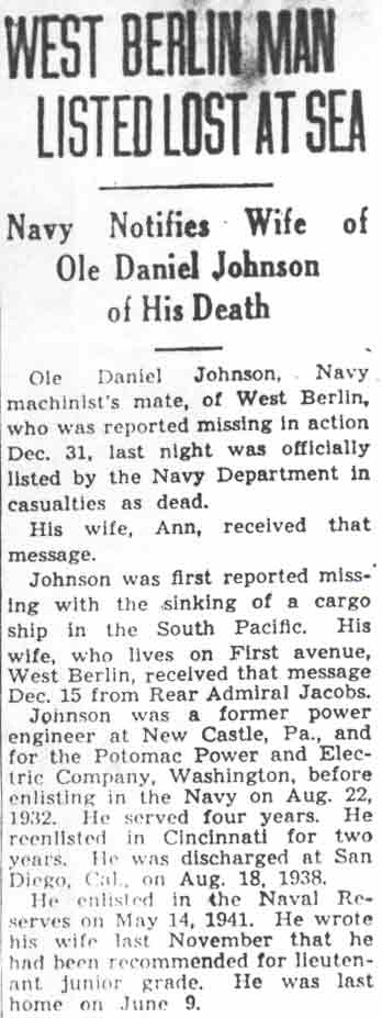 CHIEF MACHINIST'S MATE OLE DANIEL JOHNSON was a former power engineer at New Castle PA, and for the Potomac Power and Electric Company in Washington DC, before enlisting in the United States Navy on August 22, 1932. He served for four years, and re-enlisted for another two at Cincinnati OH in 1936. He was discharged at San Diego CA on August 18, 1938. On May 14, 1941 Ole Johnson enlisted in the United States Naval Reserve. He was last home on June 9, 1942, before going off to his assignment, a cargo ship in the Pacific. In a letter to his wife, Ann Johnson sent in November of 1942, he wrote that he had been recommended for a promotion to Lieutenant Junior Grade. Chief Johnson was reported as missing in action on December 31, 1942. The Navy declared him dead in the casualty list released on March 24, 1944. Ole Johnson had lived on First Avenue in West Berlin NJ. He was survived by his wife, who had moved to Bethel Avenue in West Berlin. |