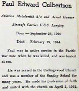 AVIATION METALSMITH PAUL E. CULBERTSON was born on September 26, 1920 to Edward L. and Mildred B. Held Culbertson. The family lived at 1012 Stokes Avenue in Collingswood NJ, where he attended Collingswood High School as a member of the class of 1938. His father worked as a photo engraver. Before graduation, he moved with his parents to Elkins Park PA. He was a graduate of the Peddie Institute. Paul Culbertson was living in Rhode Island and attending Brown University when he enlisted in the Navy on June 22, 1942. He underwent basic training at Newport, and was there until August 1, 1942, when he was sent to Jacksonville FL to be trained as an aviation metalsmith. In February of 1943, he completed this training, and served for the next four months at Floyd Bennett Airfield in Brooklyn NY. He then transferred to Quonsett Point RI to train as an aerial gunner. Completing this training, he was assigned to the new aircraft carrier USS Langley (CVL-27) in September 1943. After a shakedown trip to South America, the Langley set off for the Pacific war zone in December of 1943. In January and February of 1944, the Langley saw combat in and around the Marshall Islands. Paul Culbertson was serving aboard the carrier USS Langley, where he had recently qualified to serve as an aerial gunner, when he was killed in an accidental fall on February 19, 1944. He was buried at sea. His family received notification on March 6, 1944. Paul Culbertson was survived by his parents, Mr. and Mrs. Edward L. Culbertson, of Elkins Park PA, and an older sister, Mrs. Elizabeth Culbertson Green. His death was reported in the evening edition of the Camden Courier-Post on March 13, 1944. |