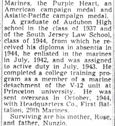Albano was attached to Marine Intelligence and was reported killed April 18 on Okinawa in a Navy Department telegram to his parents, Mr. & Mrs. Nunzio Albano. He entered the service in July, 1943 and went overseas in October, 1944. He was a graduate of Audubon High School Class of '37, and a graduate of South Jersey Law School. He received his diploma from the law school in absentia in 1944. He also attended Princeton University during a Navy V-12 course. |