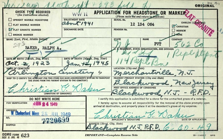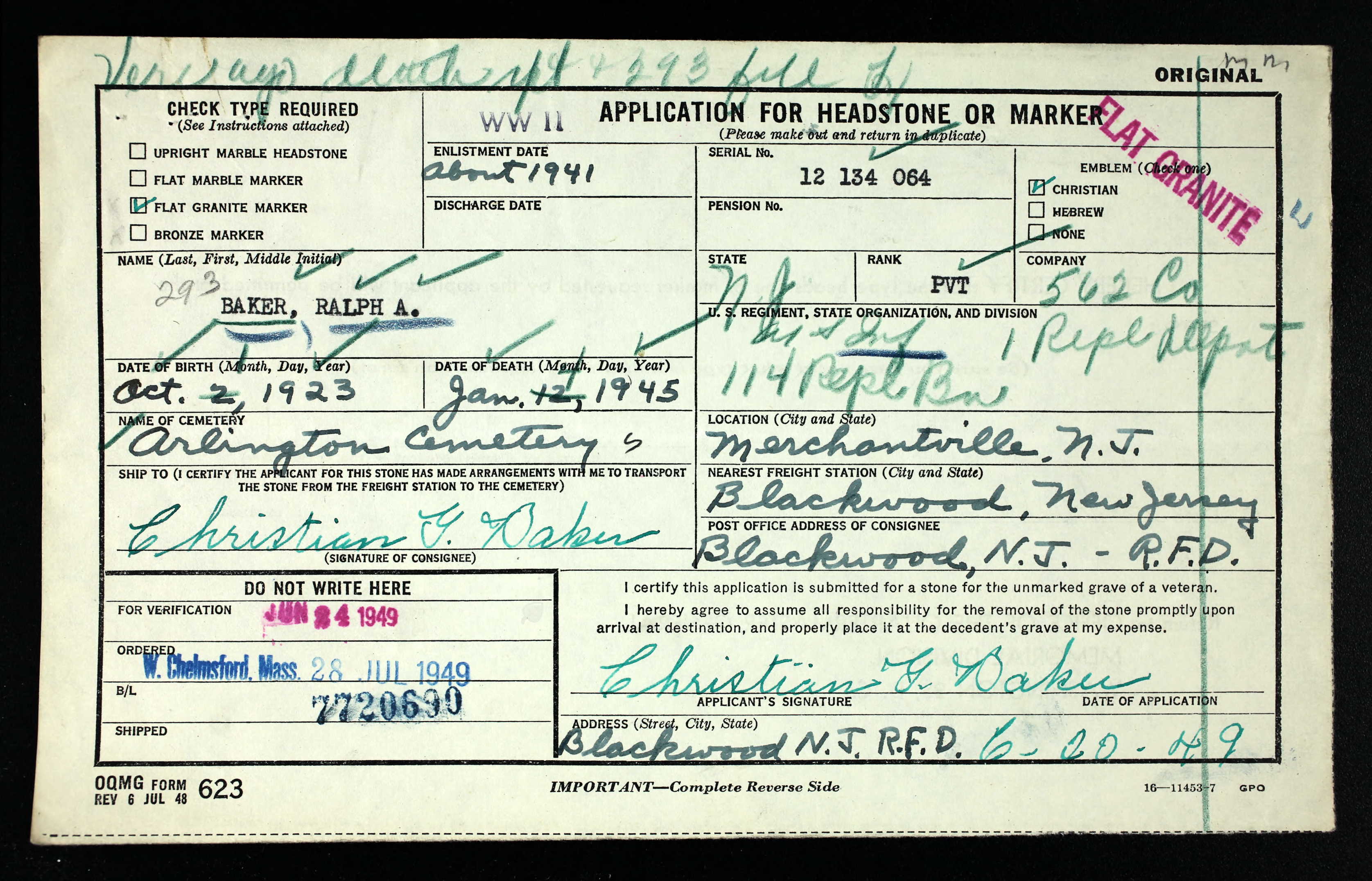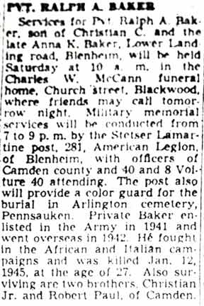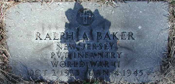 PRIVATE RALPH A. BAKER was born on October 2, 1923 to Christian C. and Anna K. Baker. His father was a veteran of World War I. The Baker family had lived on Lower Landing Road in Gloucester Township NJ. Ralph Baker enlisted in the United States Army in 1941. He went overseas the following year. Private Baker saw action in North Africa and in Italy. He died of causes not relating to combat while serving with an infantry unit in Italy on January 12, 1945. He was 27 years old. Survived by his parents and brothers William and Christian Baker Jr., Ralph Baker was brought home to New Jersey in the spring of 1949. He was buried at Arlington Cemetery in Pennsauken NJ on June 11, 1949, where today he rests next to his parents. |