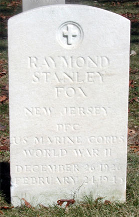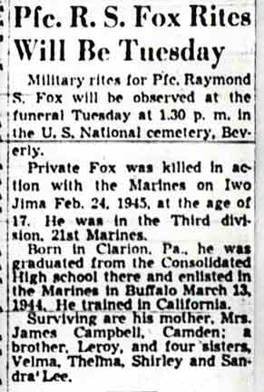 PRIVATE FIRST CLASS RAYMOND STANLEY FOX was born in Clarion PA on December 26, 1926. He graduated from Consolidated High School there. After enlisting in the Marine Corps in Buffalo NY on March 13, 1944, he trained in California. He was killed in action on Iwo Jima on February 24, 1945. He was brought back to the United States in the spring of 1948, and buried at Beverly National Cemetery on May 11, 1948. He was survived by his mother, Mrs. James Campbell, of Camden NJ, a brother, Leroy Fox, and four sisters, Velma, Thelma, Shirley, and Sandra Lee. |