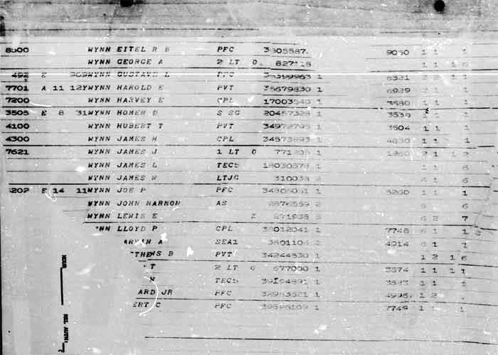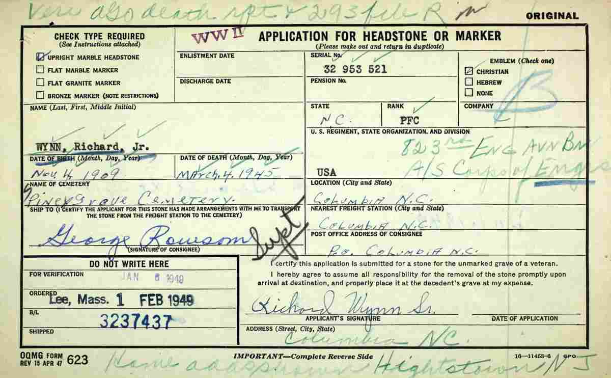 airfield work. Private First Class Richard Wynn Jr. died of causes not related to combat on March 4, 1945. Although he was born and lived most of his life in the South, Army records had his home address as Heightstown, New Jersey. He is listed in the United States Army's 1946 Honor Roll of World War II Dead as being from Camden County NJ. Richard Wynn Jr. was brought home after the war and was buried in his home town of Columbia, North Carolina. |