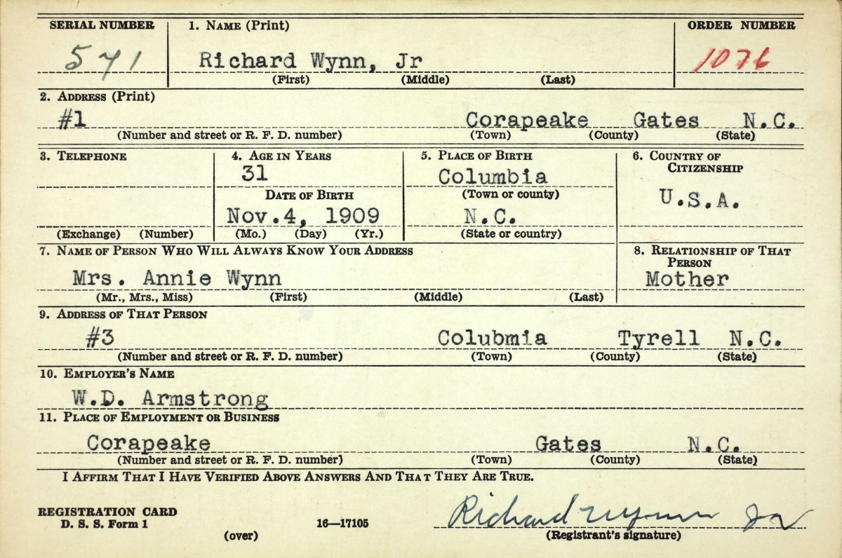 PRIVATE FIRST CLASS RICHARD WYNN JR. was born in Tyrell County, North Carolina on November 4, 1909 to Richard Wynn and his wife the former Annie Banton, the second of ten children. His father had a small farm. The 1910 Census shows the family which included older sister Mary Ann, living in Gum Neck Township, Tyrell County North Carolina. A brother, John, was born in 1911. Richjard Jr. and three other Wynn, Mildred, Edward, and Roscoe, were still living in Gum Neck Township when the Census was taken in 1940. Richard Wynn was living in Columbia, North Carolina when he was inducted into the United States Army. Assigned to the 823rd Engineer Aviation Battalion, he was sent to India with his unit. The