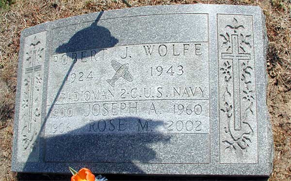 RADIOMAN'S MATE THIRD CLASS ROBERT J. WOLFE was born in 1924 in Gloucester City NJ to Joseph A. and Rose M. Wolfe of 313 Main Street. His father was a railroad telegraph operator. The family, which included older brother Edward and younger sister Dorothy, moved to the Grenloch section of Gloucester Township NJ at some point after April of 1930. Robert Wolfe had enlisted in the United States Navy prior to Pearl Harbor. Having learned Morse Code from his telegrapher father, he was trained as a radioman. Robert Wolfe served on anti-submarine duty for eleven months in the Pacific, and saw action at the Battle of Midway. After a furlough home, he was assigned to the Norfolk Naval Air Station in Norfolk VA. On March 7, 1943 Robert Wolfe was part of a three-man air crew practicing night bombing when his plane crashed in Chesapeake Bay. Wolfe was a member of Composite Squadron One (VC-1). His aircraft, a Grumman TBF-1 Avenger BuNo 01734, went missing out of NAS Norfolk with the loss of all three crew. The body of Robert J. Wolfe was not recovered until October of 1943. He was survived by his parents, brother Radioman's Mate Second Class Edward Wolfe, then serving at Boston MA, and his sister, Dorothy Wolfe. A Mass was said for him at St. Agnes Roman Catholic Church, Blackwood Terrace NJ, and he was buried at New St. Mary's Cemetery in Bellmawr NJ. His death was reported in the November 4, 1943 edition of the Camden Courier-Post. Today he lies next to his father, who passed in 1960, and his mother, who joined them in 2002. |