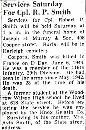 TECHNICIAN FIFTH CLASS ROBERT P. SMITH was born about 1921. He was the son of Mrs. avis Smith, and lived with his mother at 618 State Street in Camden NJ. Robert Smith attended classes at Woodrow Wilson High School in Camden, and worked at the Knox Gelatin plant in North Camden, a short walk from his home, prior to enlisting in the Army in May of 1942. Robert Smith was killed on Omaha Beach on D-Day, June 6, 1944. He was brought home to New Jersey in December of 1947, and buried at Harleigh Cemetery in Camden on December 13th. |