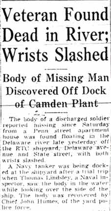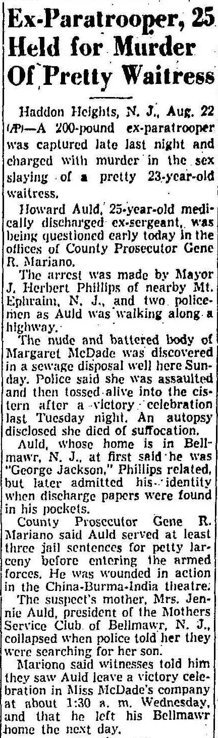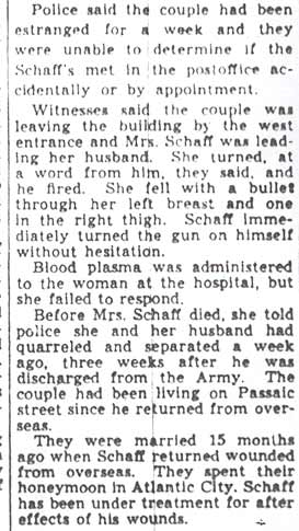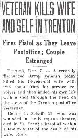 Soldiers, sailors, and airmen who had been wounded and returned to the United States, upon discharge from military hospitals and the structure of service, began returning home. On the night of August 21, 1945 at a V-J Day party in Haddon Heights, a medically discharged ex-paratrooper named Howard Auld raped and murdered Margaret McDade, a waitress from Philadelphia, a crime for which he was executed for in 1951. Others who found changes in themselves and/or in the world they returned to more than they could bear took their own lives. This was the hand dealt to Henry G. Schaff in December of 1945.
