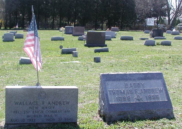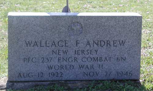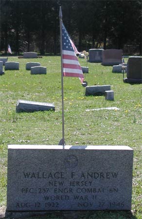 PRIVATE FIRST CLASS WALLACE F. ANDREW was born August 12, 1922 in New Jersey Thomas F. and Ethel M. Andrew. He grew up on the family farm, owned by his grandparents, Howard E. and Clara Andrew, along Chews Road between Andrew and New Freedom Roads in the Sicklerville section of Winslow Township NJ. His father passed away in 1935 at the age of 47. Wallace F. Andrew was inducted into the United States Army on June 21, 1943 at Camden, New Jersey. He was unmarried and had a grammar school education when drafted. Army records state that his occupation was "Semiskilled chauffeurs and drivers, bus, taxi, truck, and tractor". Private First Class Wallace Andrew died while serving in the United States Army on November 27, 1946. He is buried at Sicklerville Cemetery in Winslow Township NJ, where he rests next to his father. He was survived by his mother, grandmother, sister Thelma, and uncle Howard L. Andrew. |