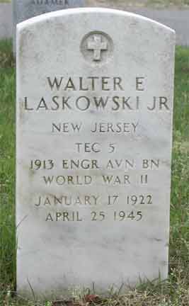 TECHNICIAN 5TH CLASS WALTER E. LASKOWSKI, son of Walter and Mary Laskowski of 1581 Louis Street, was born in Camden, January 17th, 1922. He was called to active military service as an Army Engineer in November of 1942. He was killed April 25th, 1945 during the last stages of the Philippine campaign. Walter Laskowski was survived by his parents, two brothers, Leon and Thomas, and four sisters, Eleanore, Margaret, Betty, and Dorothy. He was brought home in September of 1944 aboard the USAT Sergeant Morris E. Crain . He was buried at St. Joseph's Cemetery in Gloucester Township NJ shortly thereafter. |