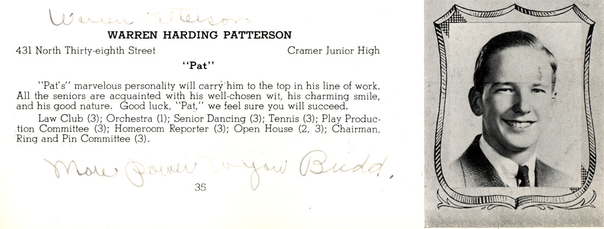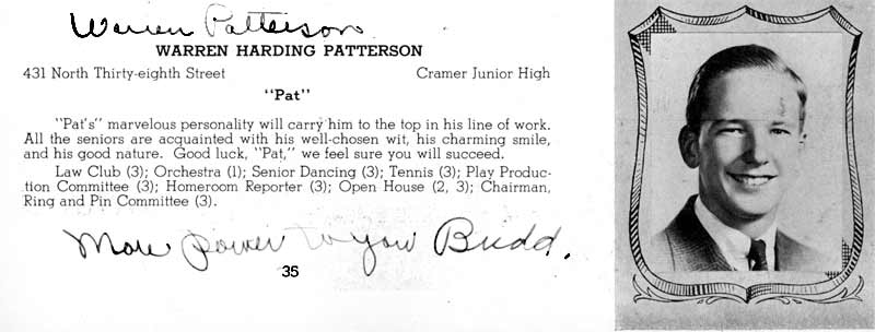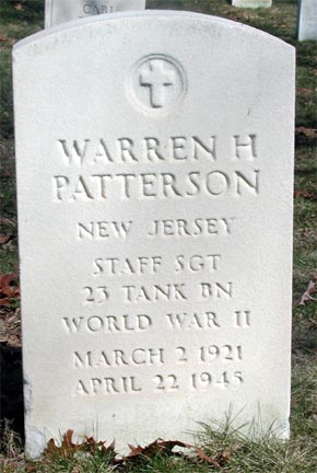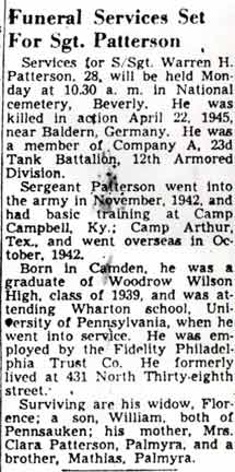 STAFF SERGEANT WARREN H. PATTERSON was born on March 2, 1921 in Camden NJ to Mathias and Clara Patterson. The Patterson family had come to Camden after 1916, and lived at 431 North 38th Street, in the East Camden section of the city. The elder Patterson worked as a clerk in a bank. Warren Patterson was a 1939 graduate of Woodrow Wilson High School in Camden, and was attending the Wharton School of Business at the University of Pennsylvania when he was drafted. He had also been working at a bank in Philadelphia, the Fidelity Philadelphia Trust Company. Inducted into the Army in November of 1942, Warren Patterson trained at Camp Campbell KY and Camp Arthur TX, and went overseas on September 20, 1944. Staff Sergeant Patterson died of wounds received in combat on April 22, 1945 near Baldern Germany. After the war Warren Patterson was returned to the United States, and he was buried at Beverly National Cemetery in Beverly NJ on August 16, 1948. He was survived by his wife, Mrs. Florence Patterson, of Pennsauken NJ, his son William Patterson, His mother Mrs. Clara Patterson, of Palmyra NJ, and his older brother, Mathias Paterson Jr. also of Palmyra. |