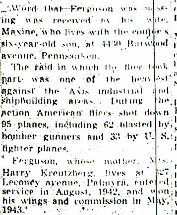 mother, Mrs. Harry Kreutzberg, of 27 Leconey Avenue in Palmyra NJ. His