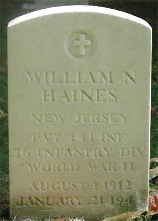 PRIVATE WILLIAM N. HAINES was born on August 1, 1912. He had ties to both Gloucester Township and Pennsauken Township in Camden County NJ. Inducted into the Army late in the war, he was killed in action while serving with the 141st Infantry Regiment, 26th Infantry Division, on January 21, 1945. William N. Haines was brought home after the war ended. He was buried at Beverly National Cemetery in Beverly NJ on August 4, 1949. |